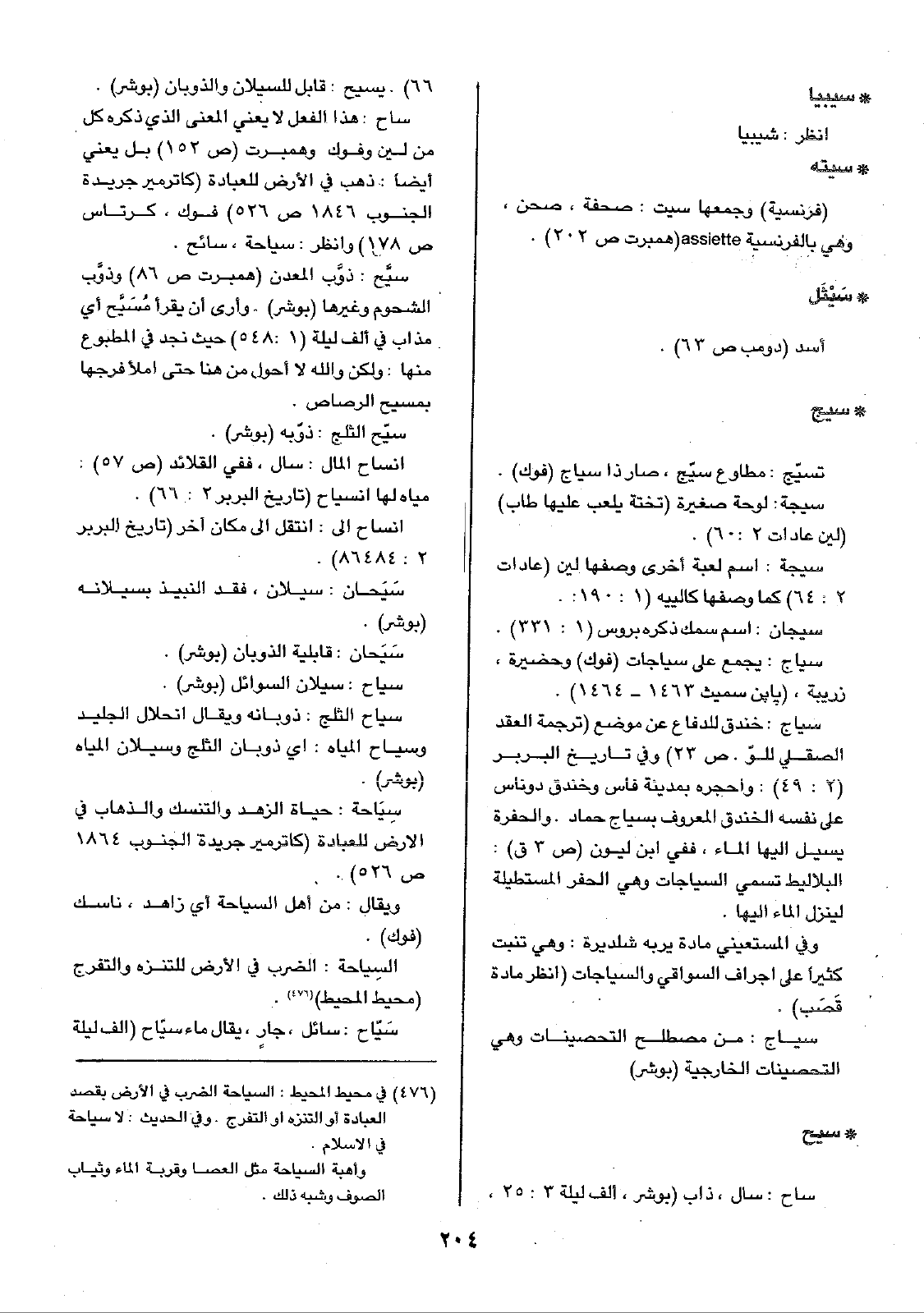 ساح: هذا الفعل لا يعني المعنى الذي ذكره كل من لين وفوك وهمبرت (ص152) بل يعني أيضاً: ذهب في الأرض للعبادة (كاترمير جريدة الجنوب 1846 ص526) فوك، كرتاس ص178) وانظر: سياحة، سائح.