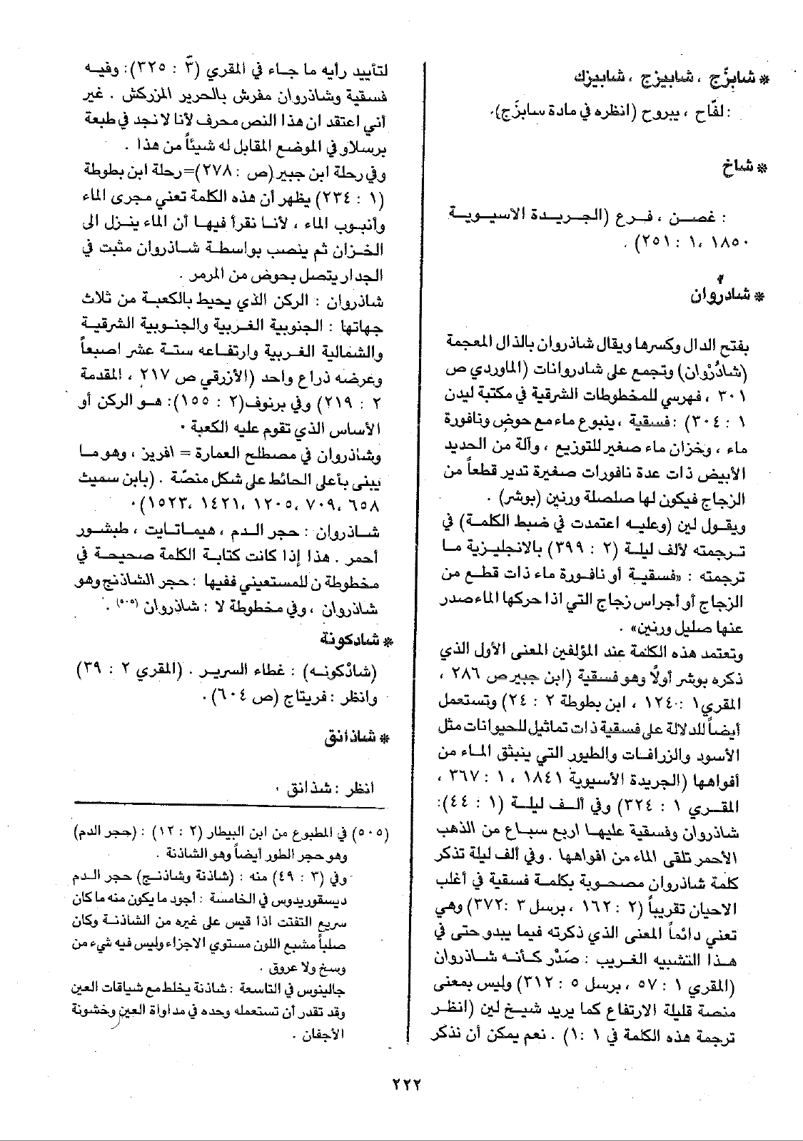 وتعتمد هذه الكلمة عند المؤلفين المعنى الأول الذي ذكره بوشر أولاً وهو فسقية (ابن جبير ص286، المقري 1: 124، ابن بطوطة 2: 24) وتستعمل أيضاً للدلالة على فسقية ذات تماثيل للحيوانات مثل الأسود والزرافات والطيور التي ينبثق الماء من أفواهها (الجريدة الأسيوية 1841، 1: 367، المقري 1: 324) وفي ألف ليلة (1: 44): شاذروان وفسقية عليها أربع سباع من الذهب الأحمر تلقى الماء من أفواهها. وفي ألف ليلة تذكر كلمة شاذروان مصحوبة بكلمية فسقية في أغلب الأحيان تقريباً (2: 162، برسل 3: 372) وهي تعني دائماً المعنى الذي ذكرته فيما يبدو حتى في هذا التشبيه الغريب: صَدْر كأنه شاذروان (المقري 1: 57، برسل 5: 312) وليس بمعنى منصة قليلة الارتفاع كما يريد شيخ لين (انظر ترجمة هذه الكلمة في 1: 1). نعم يمكن أن نذكر لتأييد رأيه ما جاء في المقري (3: 325): وفيه فسقية وشاذروان مفرش بالحرير المزركش. غير أني أعتقد أن هذا النص محرف لأنا لا نجد في طبعة برسلاو في الموضع المقابل له شيئاً من هذا.