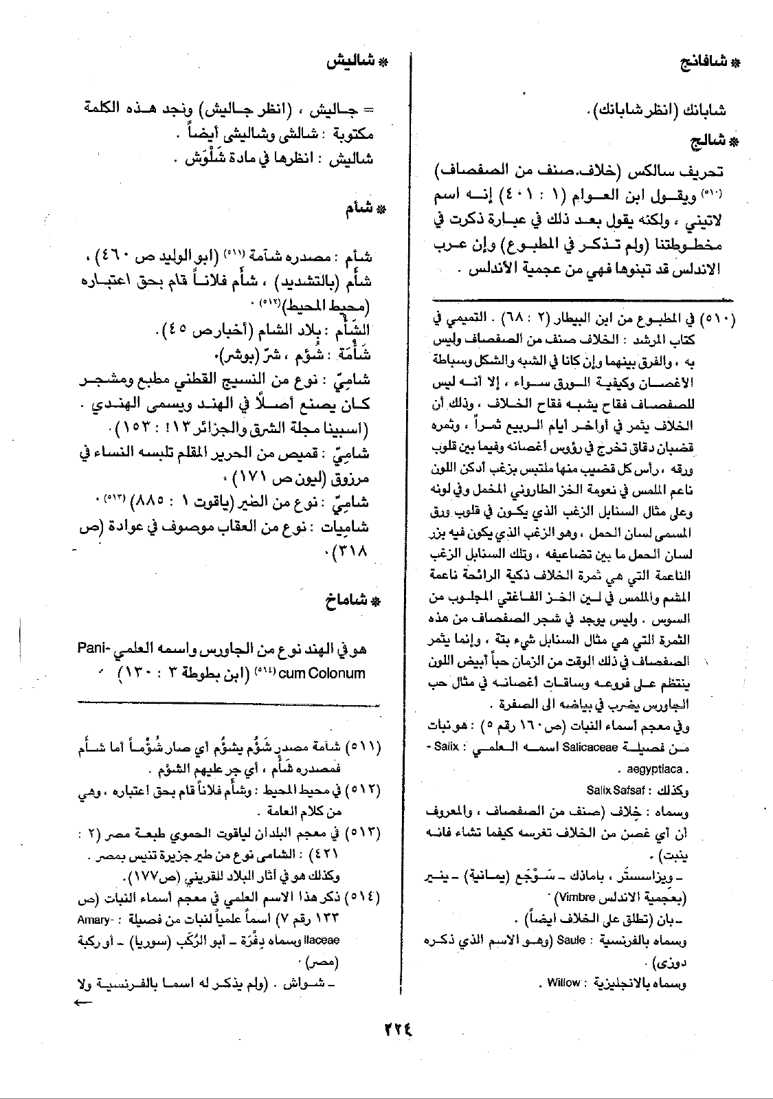 • شالج: تحريف سالكس (خلاف. صنف من الصفصاف) ويقول ابن العوام (1: 401) إنه اسم لاتيني، ولكنه يقول بعد ذلك في عبارة ذكرت في مخطوطتنا (ولم تذكر في المطبوع) وإن عرب الأندلس قد تبنوها فهي من عجمية الأندلس.