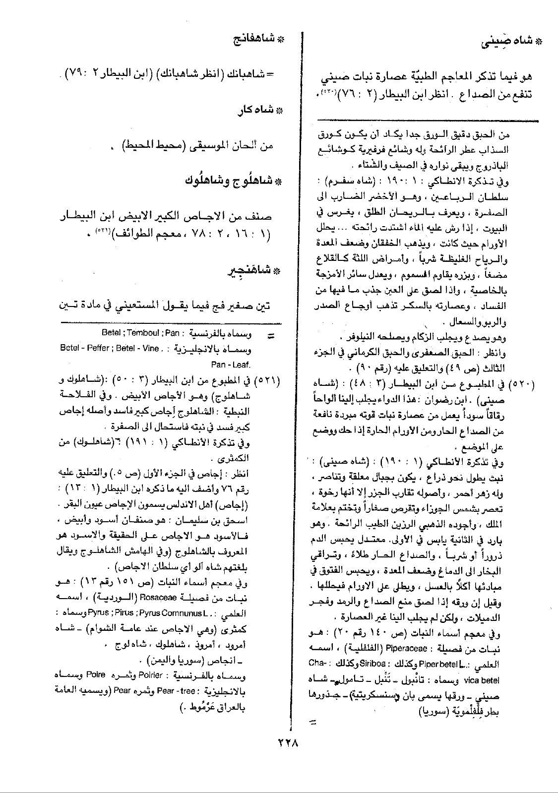 • شاه صِيني: هو فيما تذكر المعاجم الطبيّة عصارى نبات صيني تنفع من الصداع. انظر ابن البيطار (2: 76).