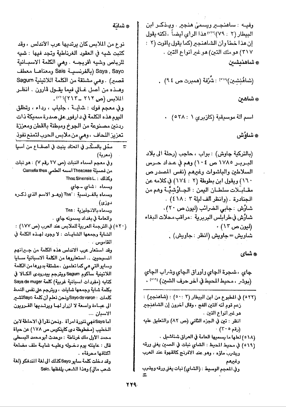 • شايَة: نوع من الملابس كان يرتديها عرب الأندلس، وقد كتبت شيه في العقود الغرناطية وتجد فيها: شيه للرباص وشيه أفريجه. وهي الكلمة الأسبانية Saya, Sayo ( بالفرنسية Saie ومعناها معطف قصير). وهي مشتقة من الكلمة اللاتينية Sagum وهذه من أصل غالي فيما يقول فارون. انظر الملابس (ص212 - 213).