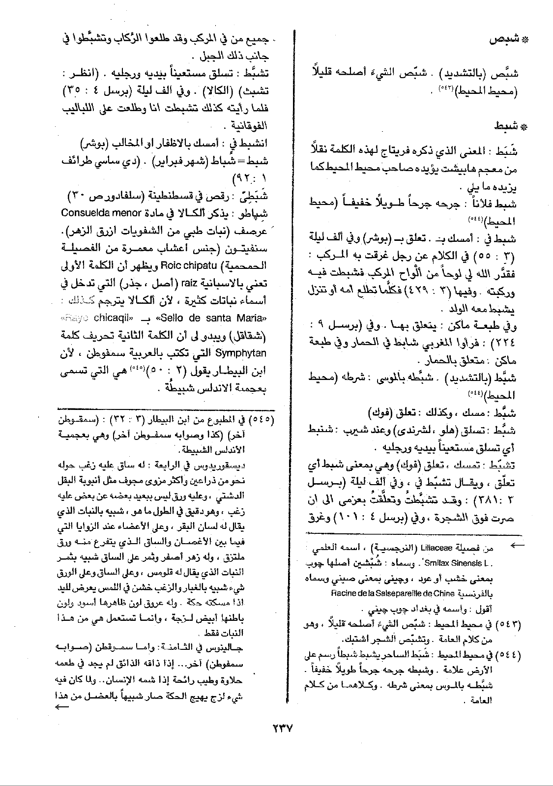 سنفيتون (جنس أعشاب معمرة من الفصيلة الحمحمية) Roic chipatu ويظهر أن الكلمة الأولى تعني بالأسبانية raiz ( أصل، جذر) التي تدخل في أسماء نباتات كثيرة، لأن ألكالا يترجم كذلك: (( Sello de santa Maria)) ب (( Rayc chicaqil)) ( شقاقل) ويبدو لي أن الكلمة الثانية تحريف كلمة Symphytan التي تكتب بالعربية سمفوطن، لأن ابن البيطار يقول (2: 50) هي التي تسمى بعجمية الأندلس شبيطُة.