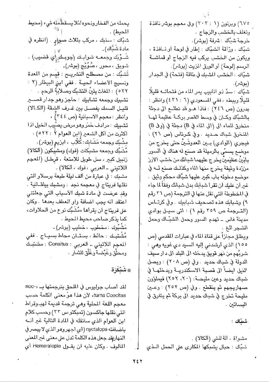 شبّاك: سدّ ذو أنابيب يمر الماء من فتحاته قليلاً قليلا وببطء، ففي المسعودي (6: 431) وانظر: بدرون (ص246): فإذا هو قد تطلع إلى دجلة بالشبّاك وكان في وسط القصر بركة عظيمة لها منخرق للماء إلى (إلى الماء في B) دجلة في (وفي B) المنخرق شباك حديد. وفي كرتاس (ص21): فيجري (الوادي) بين العدوتَيْن حتى يخرج من موضع يسمّى بالرميلة قد صنع له هناك في السور بابَيْن عظيَمينْ يخرج عليهما شبائك من خشب الأرز مزرّدة وثيقة يخرج منها الماء وكذلك صنع له في موضع دخوله باب كبير عليها شبَّاك محكم وثيق. غير أن عليك أن تقرأ شبابك بدل شبائك وفقاً لما جاء في المخطوطة التي نقل عنها في الترجمة (ص31 رقم9) وشبابك هذه تصحيف شبابيك. وفي كرتاس (الترجمة ص359 رقم1): اتى سيل بوادي مدينة فاس - تهدم السور وحمل الشبّاك وحمل الشجر الخ.