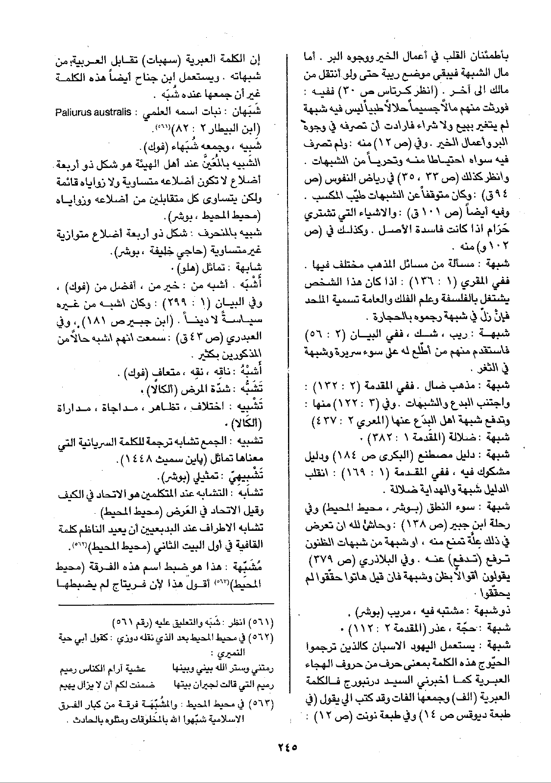 شبهة: مذهب ضال. ففي المقدمة (2: 132): واجتنب البدع والشبهات. وفي (3: 122) منها: وتدفع شبهة أهل البِدَع عنها (المعري 2: 437) شبهة: ضلالة (المقدمة 1: 382).