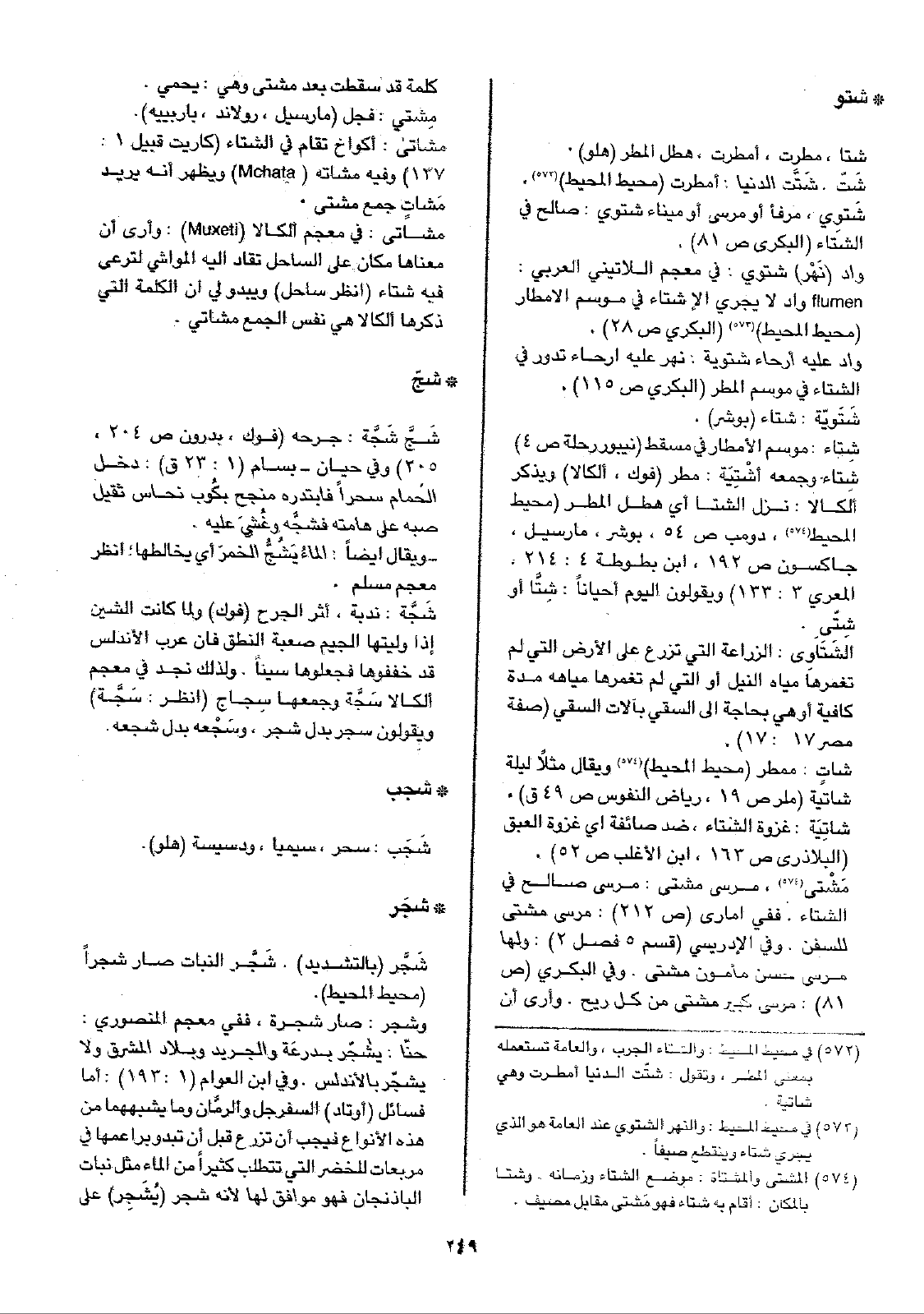 مشاتى: في معجم ألكالا ( Muxeti) : وأرى أن معناها مكان على الساحل تقاد إليه المواشي لترعى فيه شتاء (انظر ساحل) ويبدو لي أن الكلمة التي ذكرها الكالا هي نفس الجمع مشاتي.