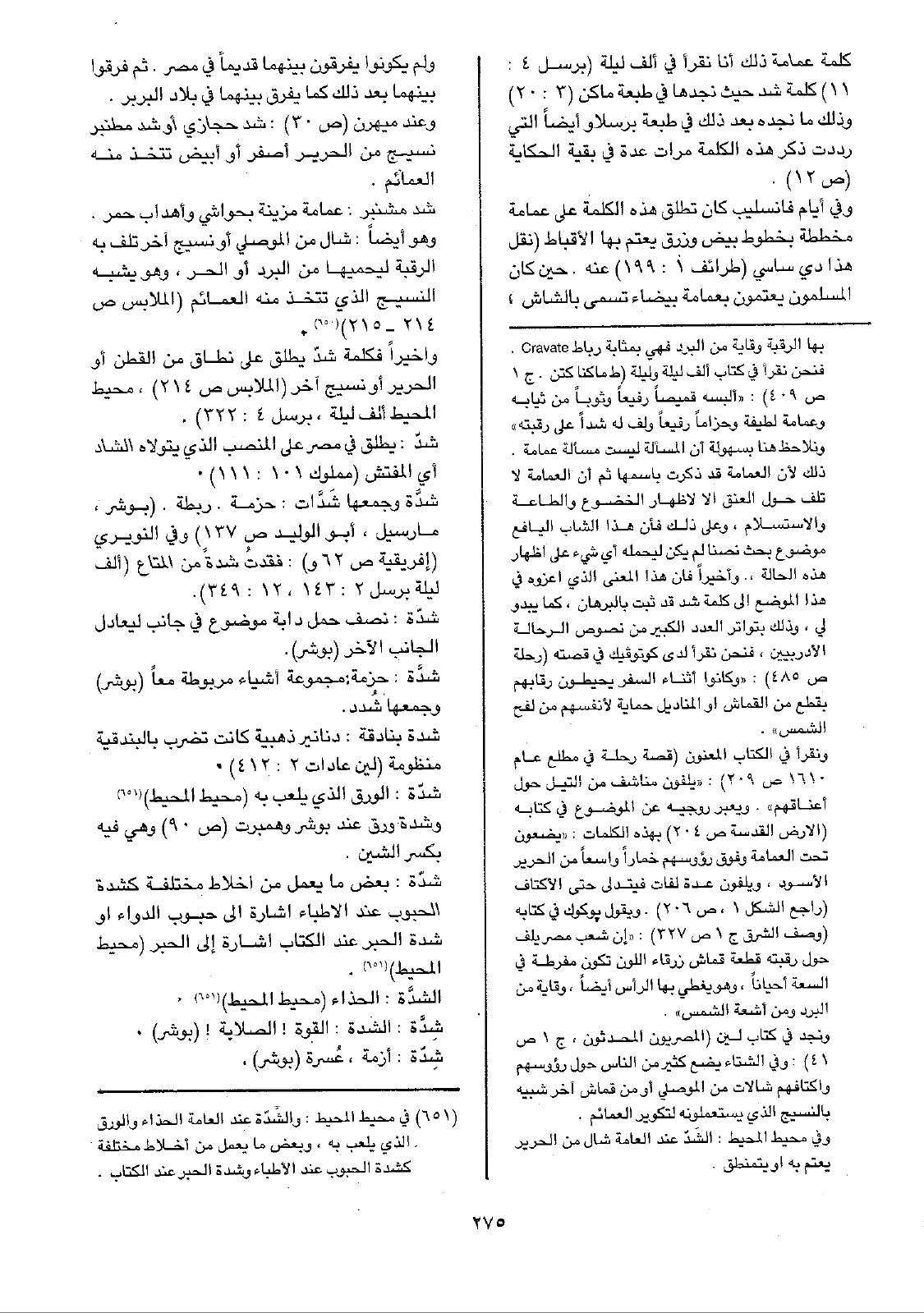 كلمة عمامة ذلك أنا نقرأ في ألف ليلة (برسل 4: 11) كلمة شد حيث نجدها في طبعة ماكن (3: 20) وذلك ما نجده بعد ذلك في طبعة برسلاو أيضاً التي رددت ذكر هذه الكلمة مرات عدة في بقية الحكاية (ص12).