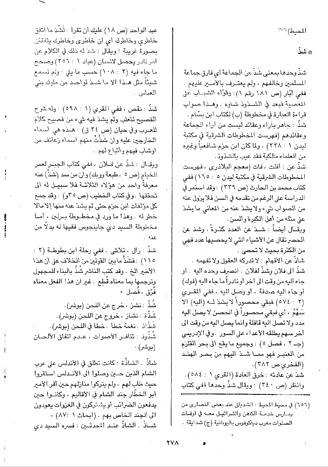 • شذّ: شذّ وحدها بمعنى شَذّ عن الجماعة أي فارق جماعة المسلمين وخالفهم، ولم يعترف بالأمير عليهم. ففي أبّار (ص181 رقم1): وقوّاه الشباب على المعصية فبعد في الشذوذ شأوه. وهذا صواب قراءة العبارة في مخطوطة (ب) لكتاب ابن بسّام.