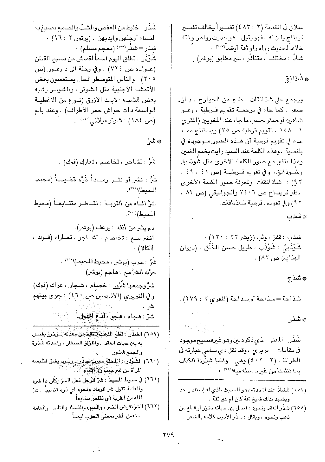 • شذر: شَذّر: المعنى الذي ذكره لين وهو غير فصيح موجود في مقامات الحريري، وقد نقل دي ساسي عبارته في الطرائف (2: 402) وهي: وإنما شذَّرنا الكتاب بما نظمنا من غير سمطه فيه.