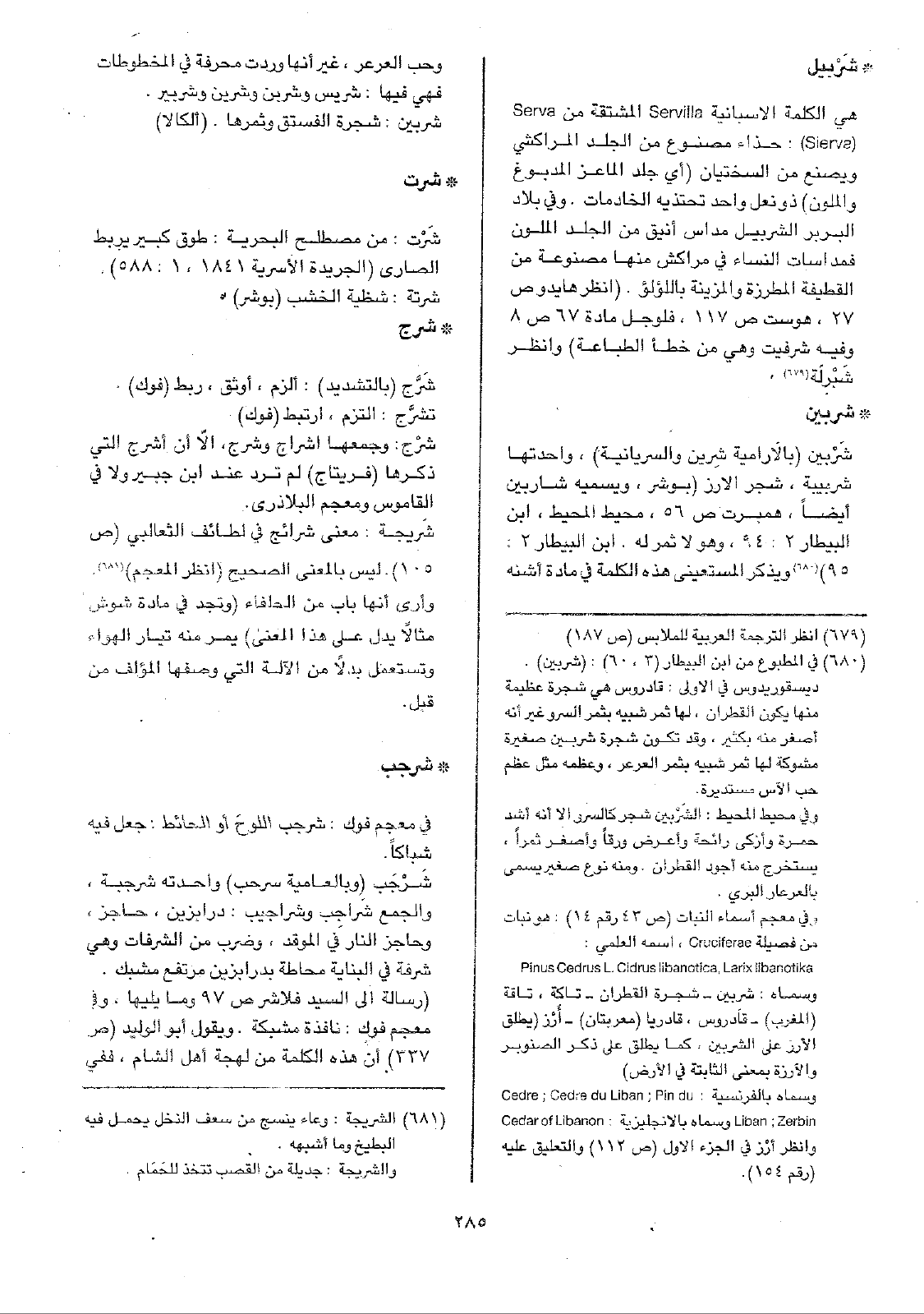 • شربين: شَرْبين (بالآرامية شِرين والسريانية)، واحدتها شربيبة، شجر الأرز (بوشر، ويسميه شاربين أيضاً، همبرت ص56، محيط المحيط، ابن البيطار 2: 94، وهو لا ثمر له. ابن البيطار 2: 95) ويذكر المستعيني هذه الكلمة في مادة أشنه وحب العرعر، غير أنها وردت محرفة في المخطوطات فهي فيها: شريس وشربن وشرين وشربير.