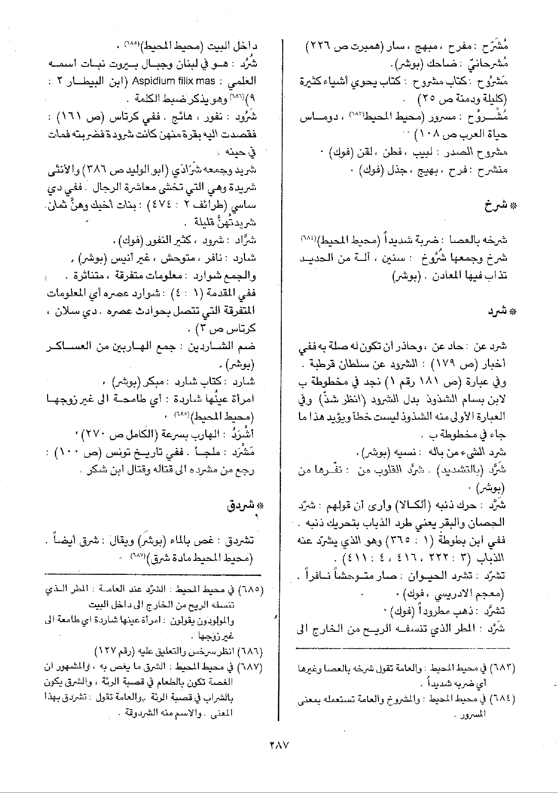 • شرخ: شرخه بالعصا: ضربة شديداً (محيط المحيط) شرخ وجمعها شُرُوخ: سنين، آلة من الحديد تذاب فيها المعادن. (بوشر) • شرد: شرد عن: حاد عن، وحاذر أن تكون له صلة به ففي أخبار (ص179): الشرود عن سلطان قرطبة.