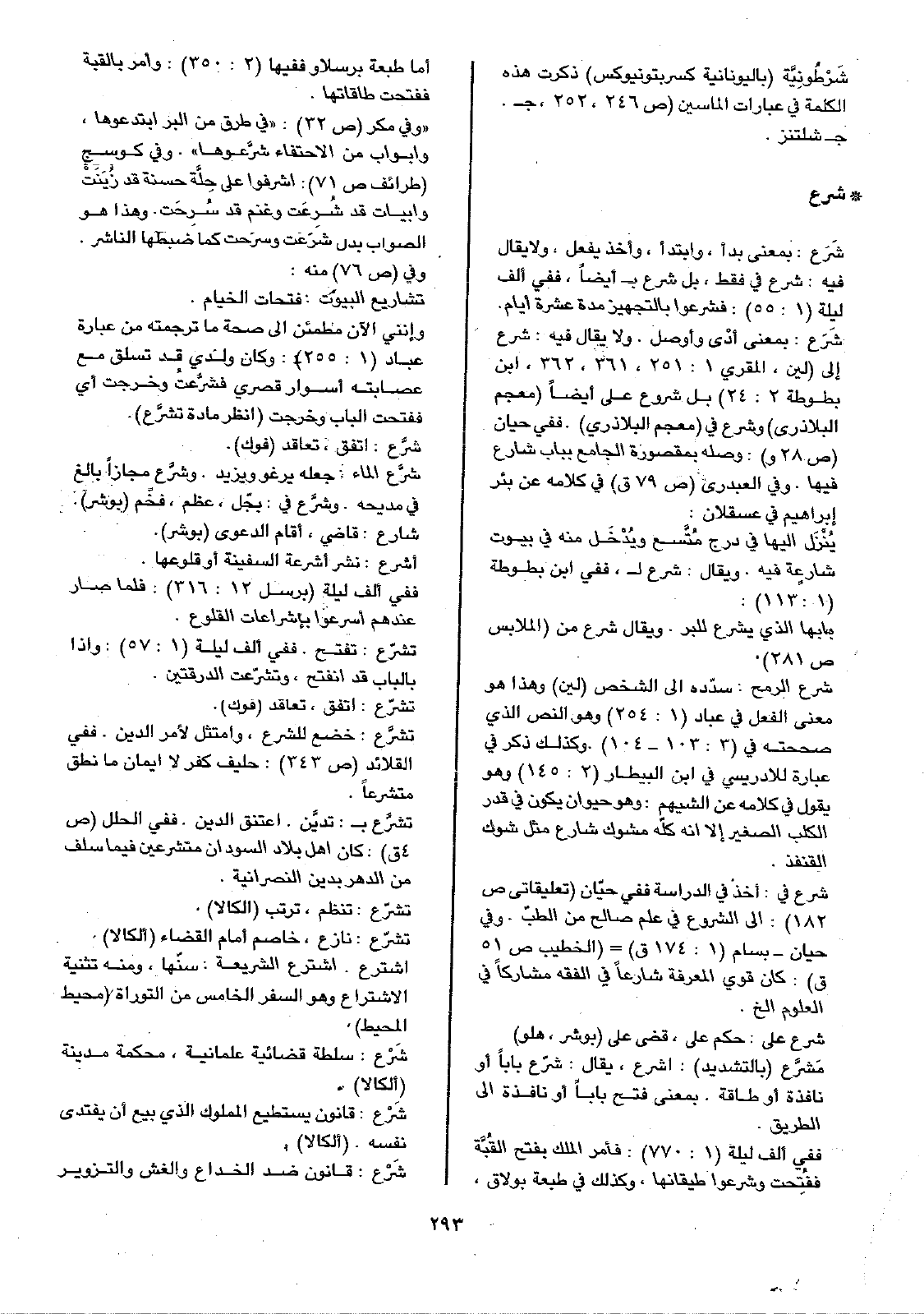 ((وفي مكر (ص32): ((في طرق من البر ابتدعوها، وأبواب من الاحتفاء شرَّعوها)). وفي كوسج (طرائف ص71): اشرفوا على حِلَّة حسنة قد زُيَنَتْ وأبيات قد شُرِعَت وغنم قد سُرِحَت. وهذا هو الصواب بدل شَرَعت وسرَحت كما ضبطها الناشر. وفي (ص76) منه: تشاريع البيوت: فتحات الخيام.