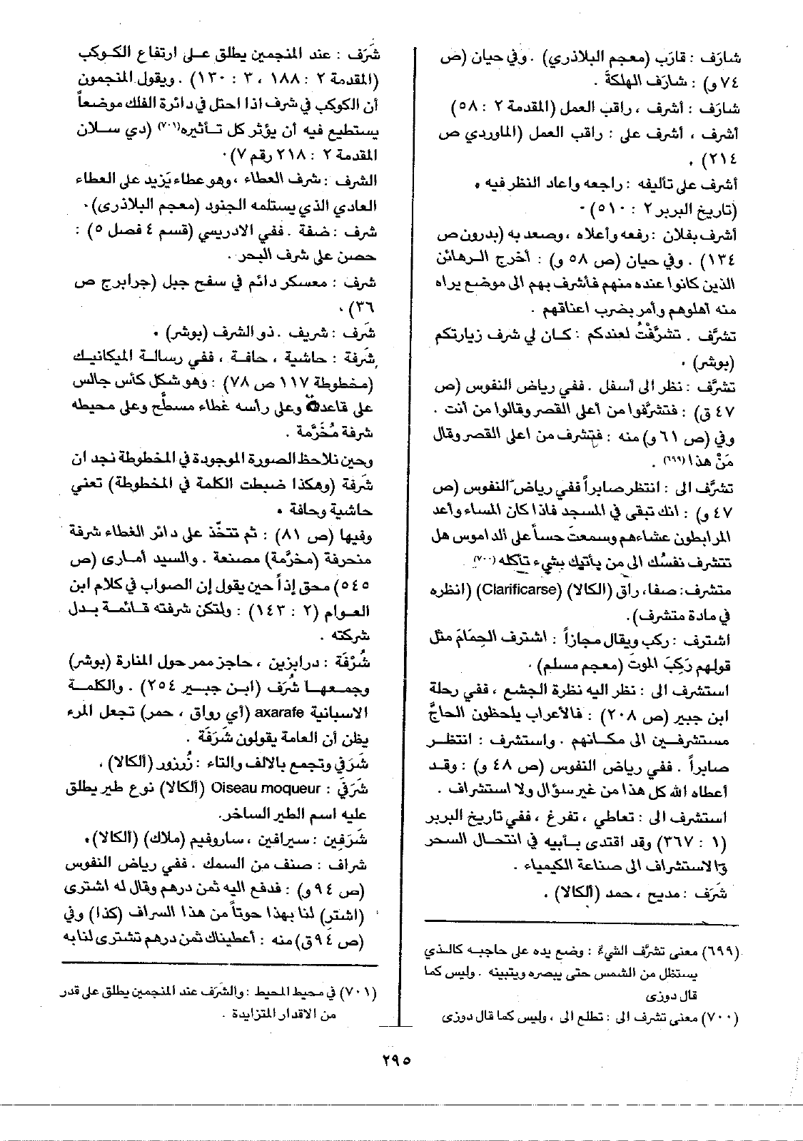 شَرَف: عند المنجمين يطلق على ارتفاع الكوكب (المقدمة 2: 188، 3: 130). ويقول المنجمون أن الكوكب في شرف إذا احتل في دائرة الفلك موضعاً يستطيع فيه أن يؤثر كل تأثيره (دي سلان المقدمة 2: 218 رقم 7).