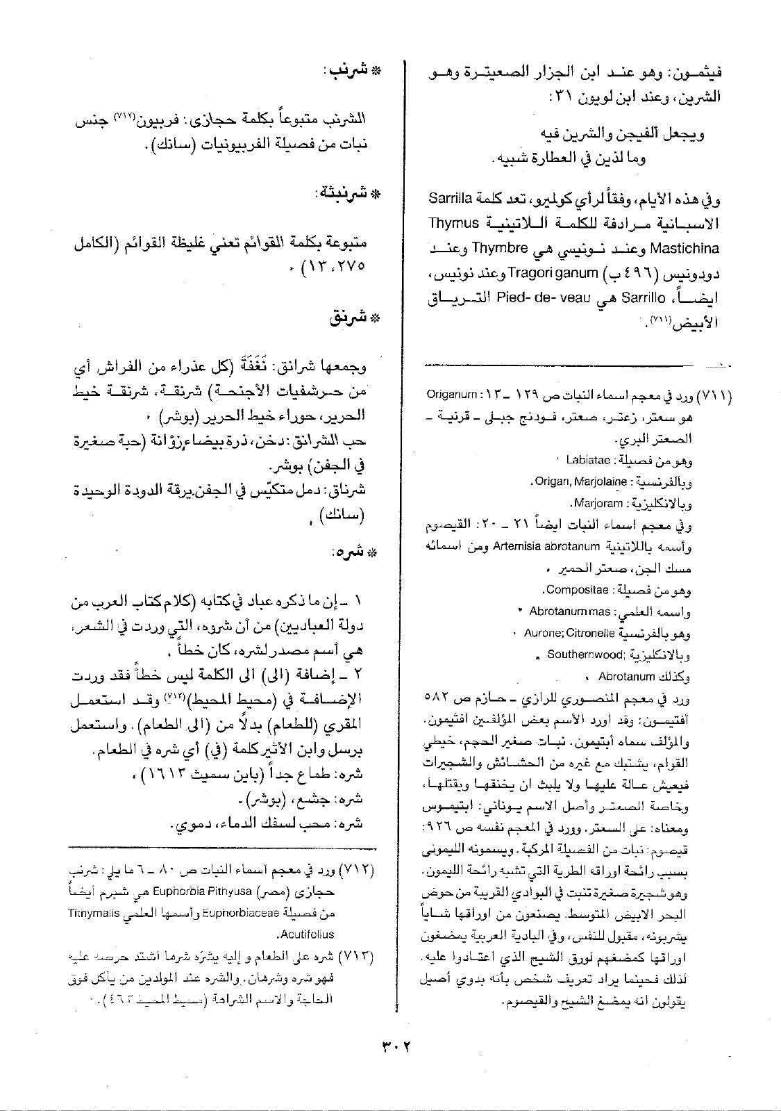 وفي هذه الأيام، وفقاً لرأي كولميرو، تعد كلمة Sarrilla الأسبانية مرادفة للكلمة اللاتينية Thymus Mastichina وعند نونيسي هي Thymbre وعند دودونيس (496ب) Tragori ganum وعند نونيس، ايضاً، Sarrillo هي Pied-de-veau الترياق الأبيض.