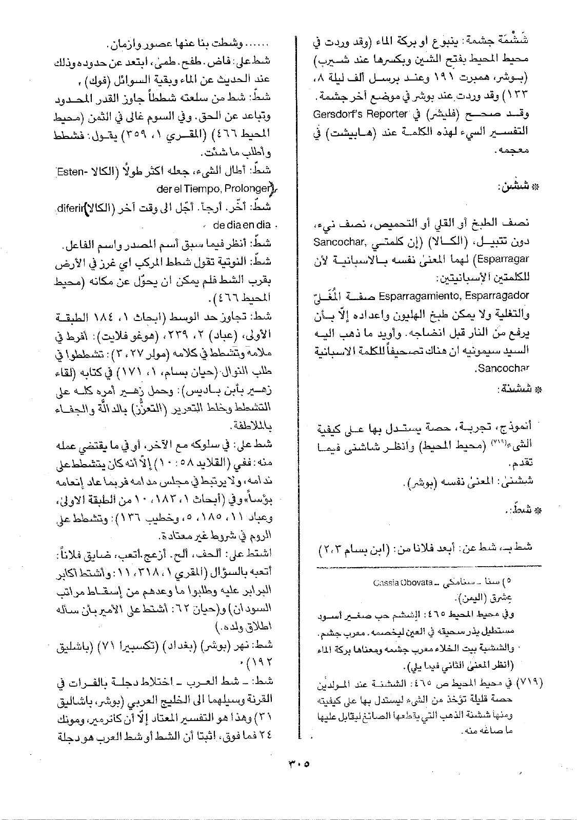 شَشْمَة جشمة: ينبوع أو بركة الماء (وقد وردت في محيط المحيط بفتح الشين وبكسرها عند شيرب) (بوشر، همبرت 191 وعند برسل ألف ليلة 8، 133) وقد وردت عند بوشر في موضع آخر جشمة. وقد صحح (فليشر) في Gersdorf's Reporter التفسير السيئ لهذه الكلمة عند (هابيشت) في معجمه.