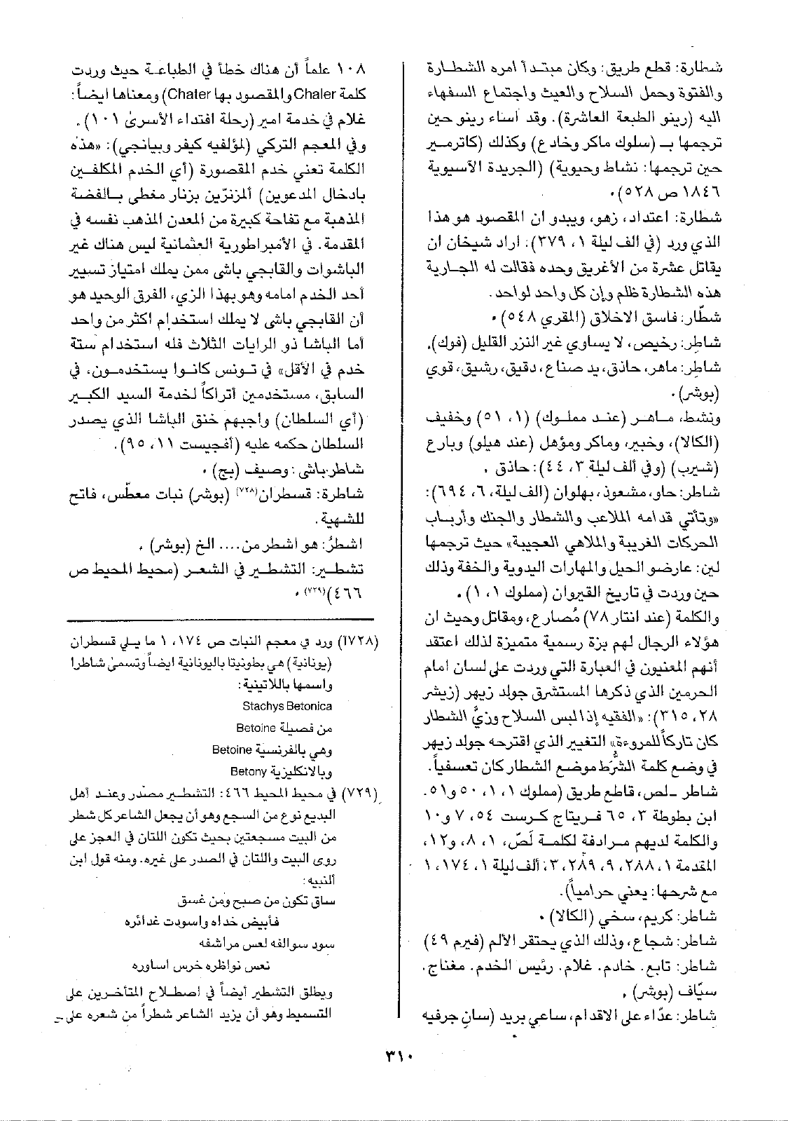 شطارة: قطع الطريق: وكان مبتدأ أمره الشطارة والفتوة وحمل السلاح والعيث واجتماع السفهاء إليه (رينو الطبعة العاشرة). وقد أساء رينو حين ترجمها ب (سلوك ماكر وخادع) وكذلك (كاترمير حين ترجمها: نشاط وحيوية) (الجريدة الآسيوية 1846 ص528).