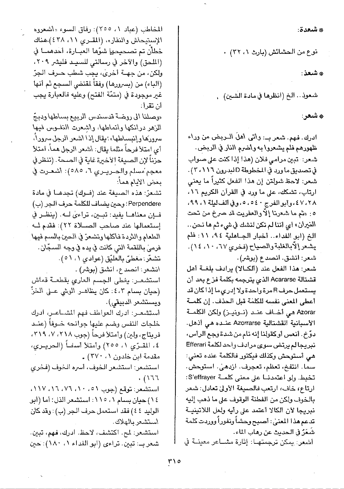 شعر: هذا الفعل عند (ألكالا) يرادف بلغة أهل قشتالة Acararse الذي يترجمه بكلمة فزع بعد أن يستعمل حرف R مرة واحدة ولا أدري ما إذا كان قد أعطى المعنى نفسه للكلمة قبل الحذف. إن كلمة Azorar هي أخاف عند (نونيز) ولكن الكلمة الأسبانية القشتالية Azorrarse عنده هي أذهل. دوّخ. انعس أو كقولنا إنه نام من شدة وجع الرأس، نبريجا لم يرتض سوى مرادف واحد لكلمة Efferari هي أستوحش وكذلك فكتور فالكلمة عنده تعني: سما. انتفخ، تعظم، تعجرف. ازدهى. استوحش. تخبط. ولو اعتمدنا على معنى كلمة S'effrayer: ارتاع، خاف، ارتعب فالصيغة الأولى تعادل: شعر بالخوف ولكن من الفطنة الوقوف على ما ذهب إليه نبريجا لأن ألكالا أعتمد على رأيه ولعل اللاتينية تدعم هذا المعنى: أصبح وحشاً ونفوراً ووردت كلمة شَعَرٌ في الحديث عن رهاب الماء.