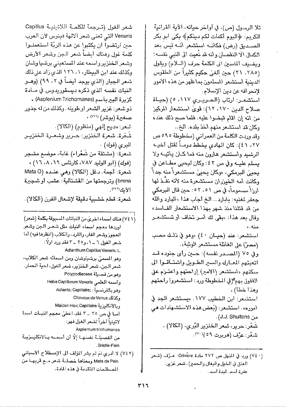 شعر الغول (ترجمة للكلمة اللاتينية Capillus Veneris التي تعني شعر الآلهة فينوس لأن العرب حين ارتضوا أن يكتبوا عن هذه الربّة استعملوا كلمة غول وهناك أيضاً شعر الجن وشعر الأرض وشعر الخنزير وأسمه عند المستعيني برشيا وشان وكذلك عند ابن البيطار 1، 126 الذي زاد على ذلك شعر الجبار (الذي يوجد أيضاً في 2، 99) (وهو النبات نفسه الذي ذكره ديسقوريدوس في مادة كزبرة البير باسم ( Asplenium Trichomanes) .