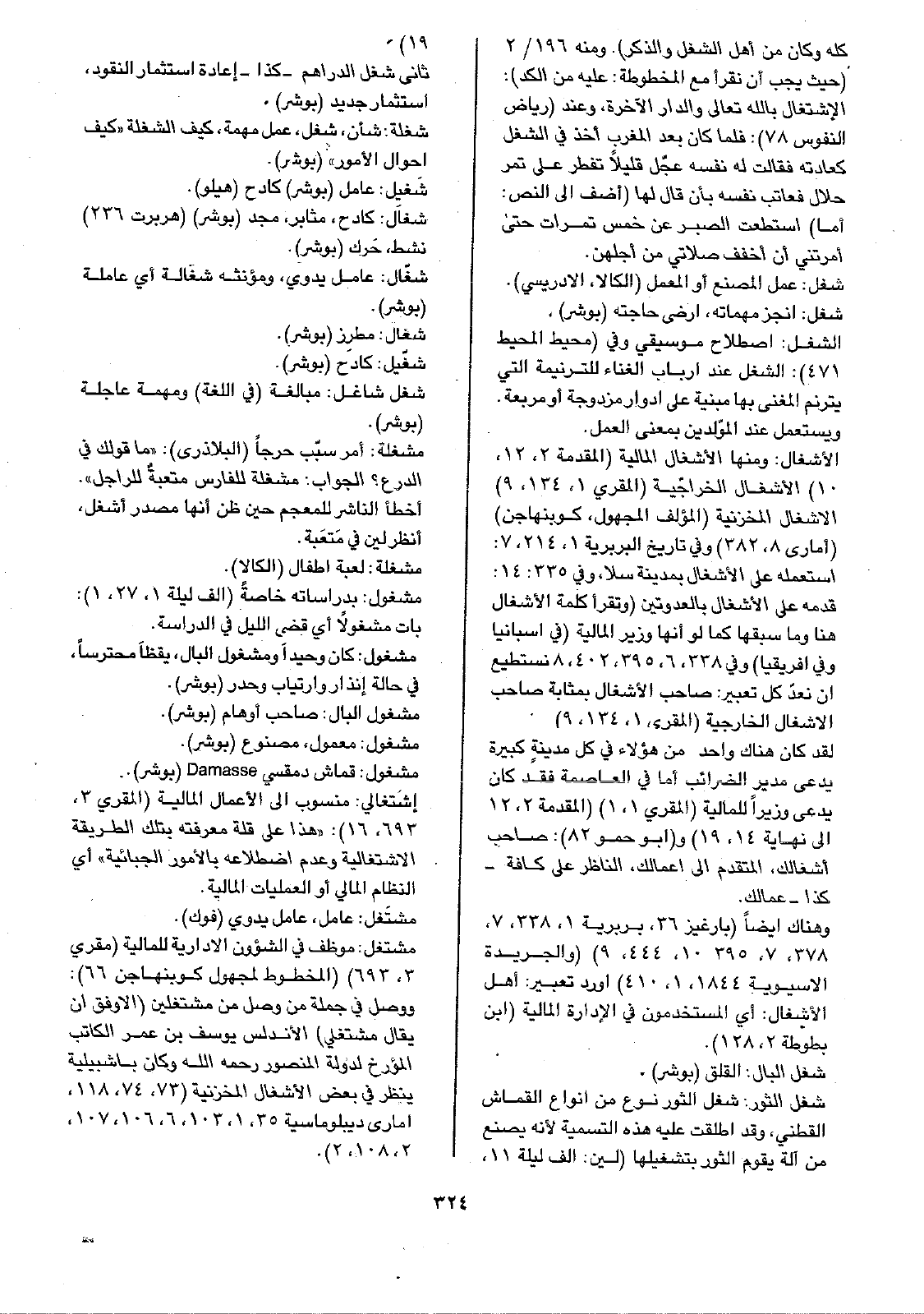 وهناك أيضاً (بارغيز 36، بربرية 1، 338، 7، 378، 7، 395، 10، 444، 9) (والجريدة الآسيوية 1844، 1، 410) أورد تعبير: أهل الأشغال: أي المستخدمون في الإدارة المالية (ابن بطوطة 2، 128).