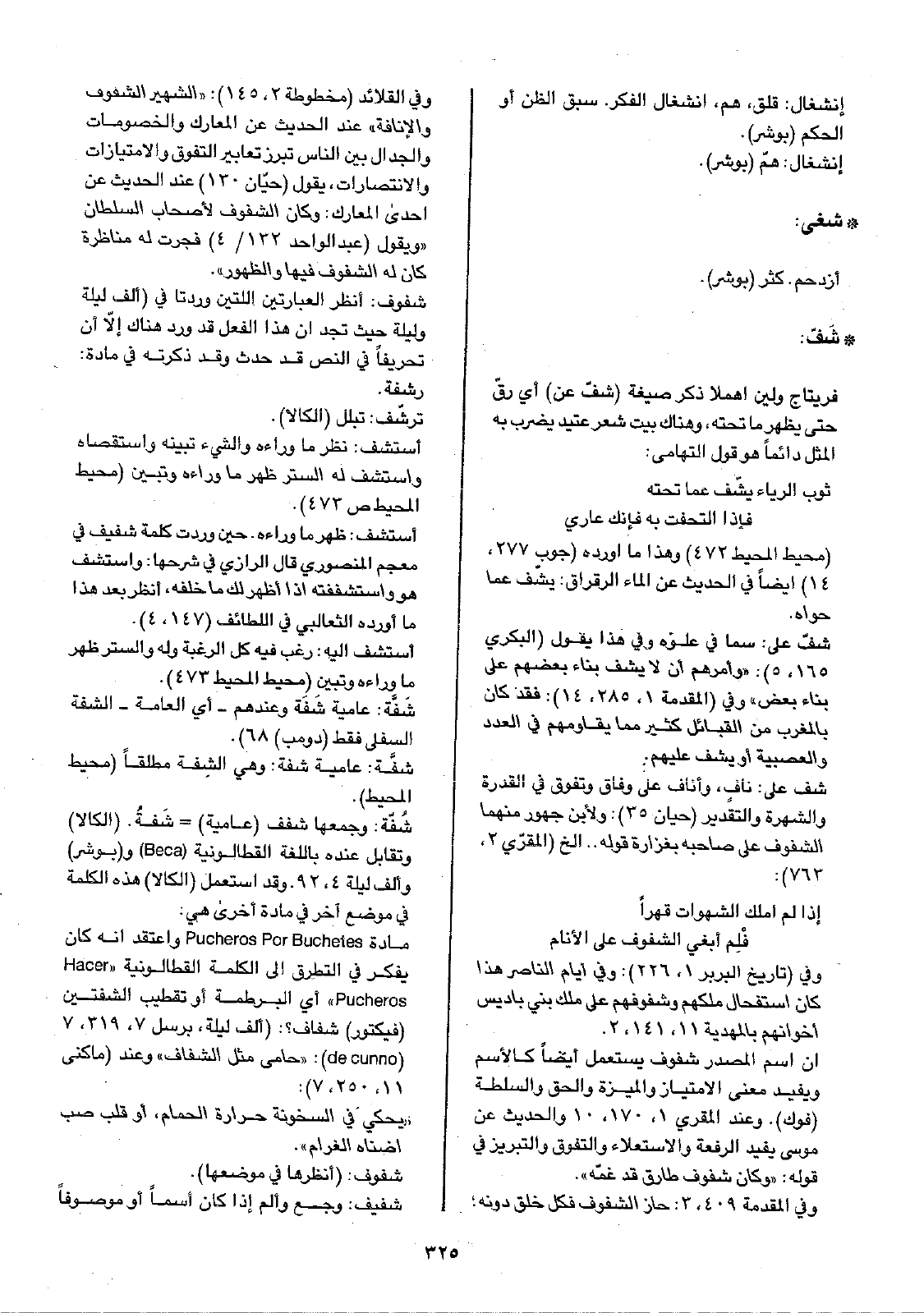 شُفّة: وجمعها شفف (عامية) = شَفةُ. (الكالا) وتقابل عنده باللغة القطالونية ( Beca) و (بوشر) وألف ليلة 4، 92. وقد استعمل (الكالا) هذه الكلمة في موضع آخر في مادة أخرى هي: مادة Pucheros Por Buchetes واعتقد إنه كان يفكر في التطرق إلى الكلمة القطالونية (( Hacer Pucheros)) أي البرطمة أو تقطيب الشفتين (فكتور) شفاف؟: (ألف ليلة، برسل 7، 319، 7 ( de cunno) : (( حامى مثل الشفاف)) وعند (ماكني 11، 250، 7): ((يحكي في السخونة حرارة الحمام، أو قلب صب أضناه الغرام)).