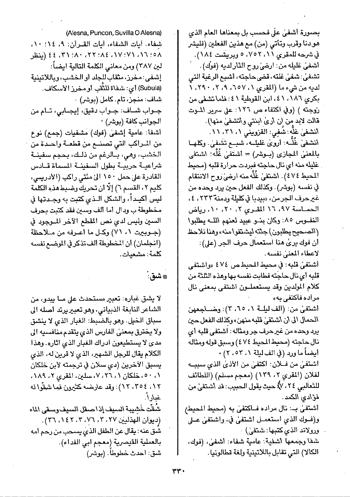 ( Alesna, Puncon, Suvilla O Alesna) شِفاء. آيات الشفاء، آيات القرآن: 9، 14؛ 10، 58؛ 16، 71؛ 17، 84؛ 22، 80؛ 31، 44 (ينظر لين 387) ومن معاني الكلمة التالية أيضاً: إشفى: مخرز، مثقاب للجلد أو الخشب، وباللاتينية ( Subula) أي: شفاءٌ للثَّقب أو مخرز السكاف.
