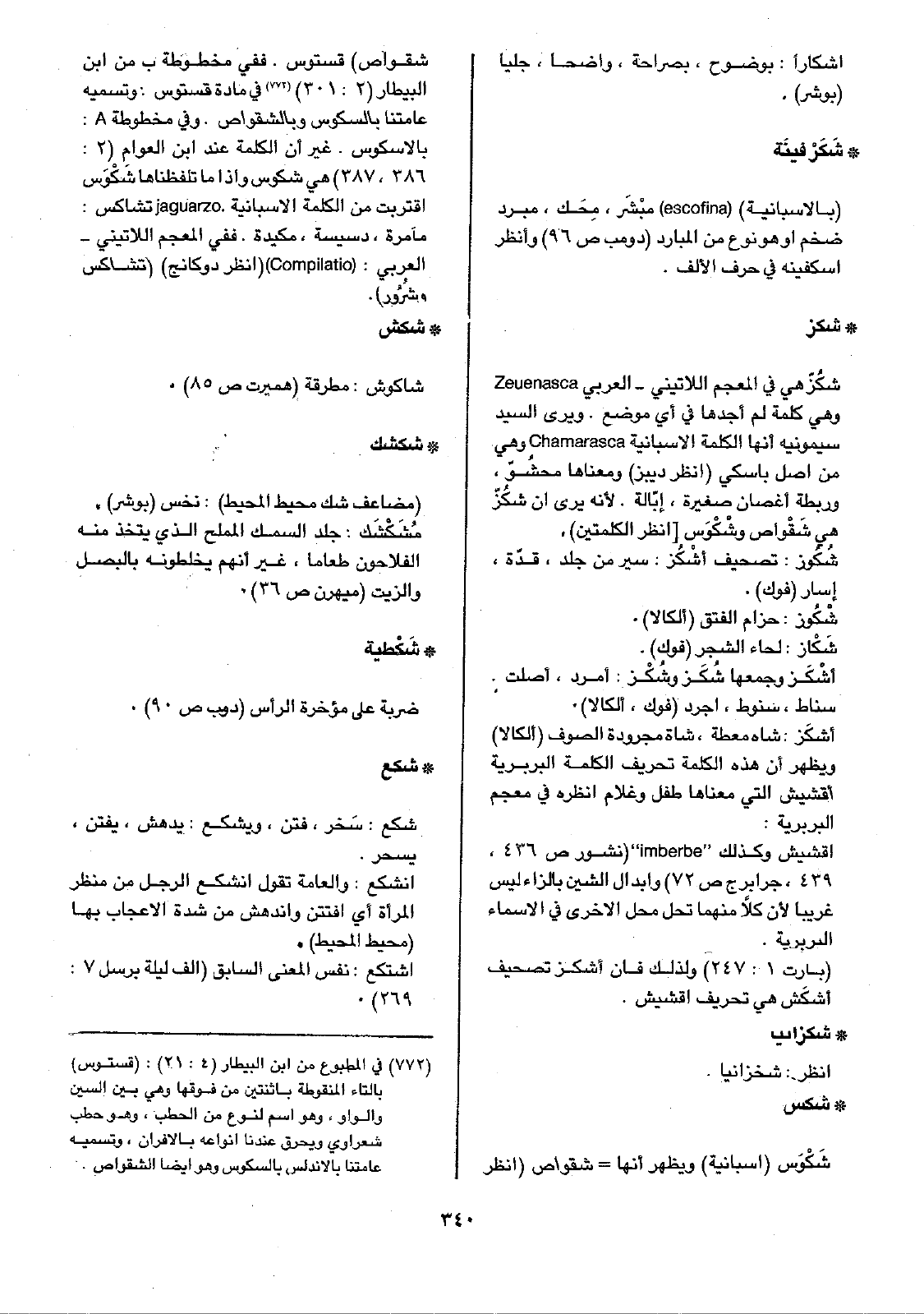 • شكز: شكُزّ هي في المعجم اللاتيني - العربي Zeuenasca وهي كلمة لم أجدها في أي موضع. ويرى السيد سيمونيه أنها الكلمة الأسبانية Chamarasca وهي من أصل باسكي (انظر ديبز) ومعناها محشُوّ، وربطة أغصان صغيرة، إبّالة. لأنه يرى أن شكُزّ هي شَقْواص وشْكْوَس (انظر الكلمتين).