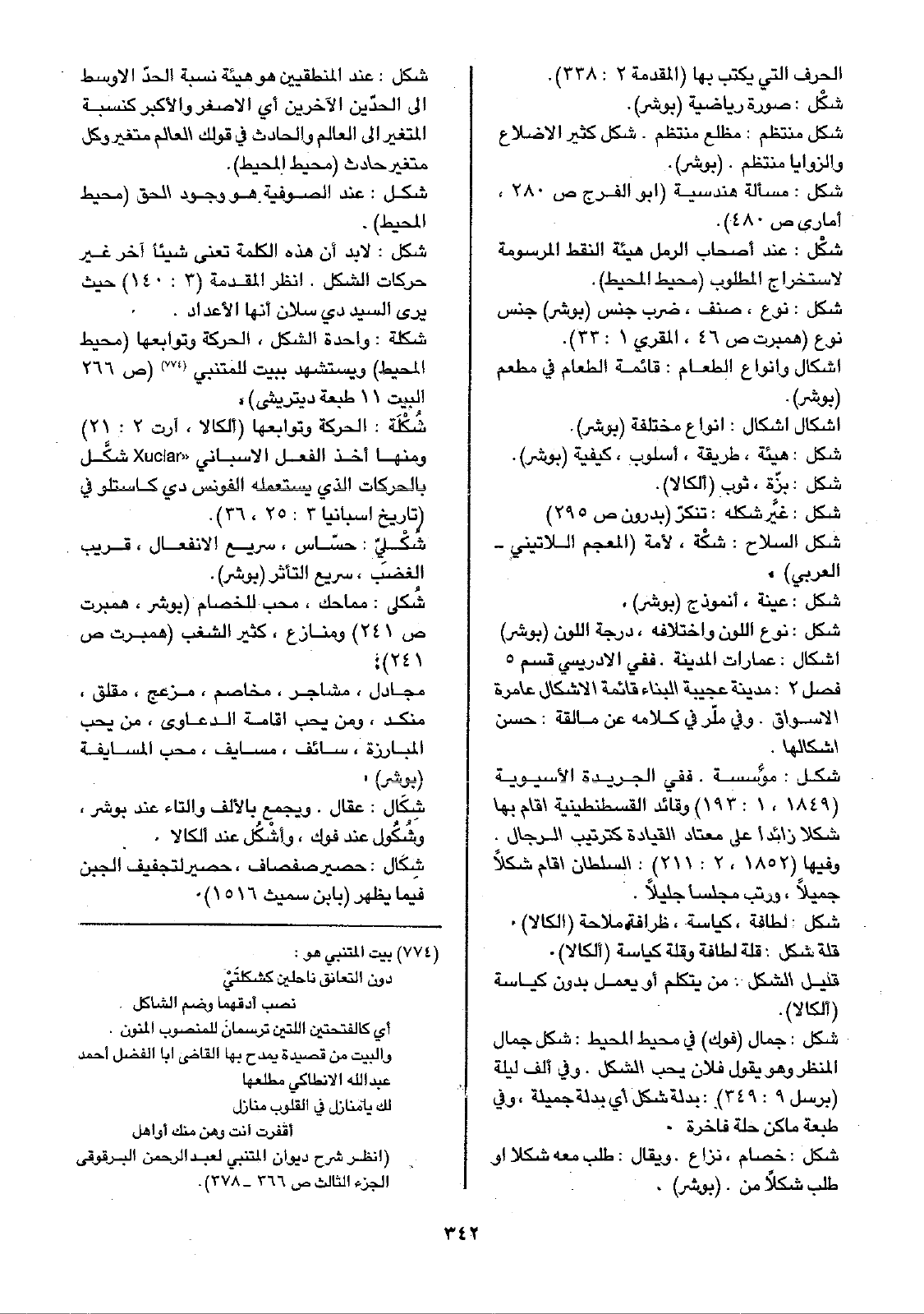 شكل: عند المنطقيين هو هيئة نسبة الحدّ الأوسط إلى الحدّين الآخرين أي الأصغر والأكبر كنسبة المتغير إلى العالم والحادث في قولك العالم متغير وكل متغير حادث (محيط المحيط).