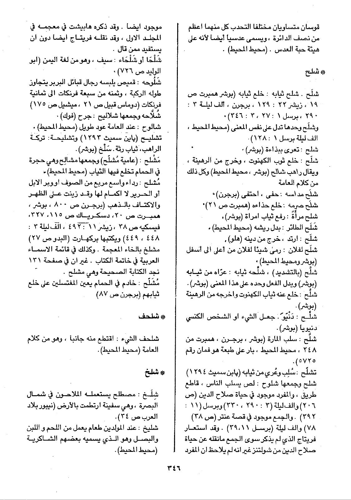 شلح وجمعها شلوح: لص يسلب الناس، قاطع طريق، والمفرد موجود في حياة صلاح الدين (ص206) وألف ليلة (3: 290، 330) وبرسل (11: 392). والجمع موجود في قصة عنتر (ص38) 78) وألف ليلة (برسل 11، 39). وقد استعار فريتاج الذي لم يذكر سوى الجمع ما نقله عن حياة صلاح الدين من شولتنز غير إنه لم يلاحظ أن المفرد موجود أيضاً. وقد ذكره هابيشت في معجمه في المجلد الأول، وقد نقله فريتاج أيضاً دون أن يستفيد ممن قال.