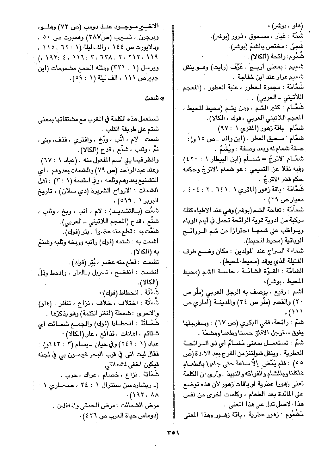 شمّ: تستعمل بمعنى مَشامّ أي ذو الرائحة العطرية. وينقل شولتنز من الفرج بعد الشدة (ص55): فلم يَمْضِ إلا ساعة حتى جاءوا بالطعام فأكلنا وبالمشام والفواكه والنبيذ. وأرى ان الكلمة تعنى زهوراً عطرية أو باقات زهور لأن هذه توضع على المائدة بعد الطعام، وكلمات أخرى من نفس هذا الأصل تدل على هذا المعنى.