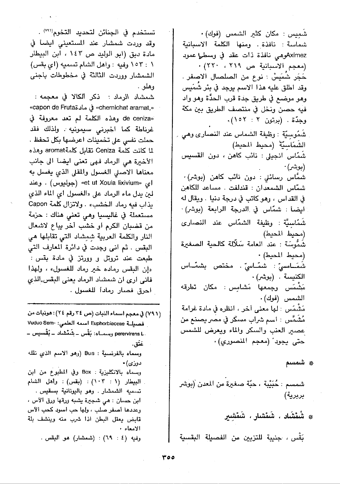 شمشاد الرماد: ذكر ألكالا في معجمه: (( chemichat aramat)) في مادة (( capon de Fruta de ceniza)) وهذه الكلمة لم تعد معروفة في غرناطة كما اخبرني سيمونيه. ولذلك فقد حملت نفسي على تخمينات اعرضها بكل تحفظ لما كانت كلمة Ceniza تقابل كلمة aromat وهذه الأخيرة هي الرماد فهي تعنى أيضاً إلى جانب معناها الأصلي الغسول والمقلي الذي يغسل به أي (( et ut Xouia lixivium)) ( جوليوس). وعند لين يدل ماء الرماد على ((الغسول أي الماء الذي يذاب فيه رماد الخشب)). ولا تزال كلمة Capon مستعملة في غاليسيا وهي تعني هناك: حزمة من قضبان الكرم أو خشب آخر يباع لإشعال النار والكلمة العربية شِمِشاد التي تقابلها هي البقس. ثم إني وجدت في دائرة المعارف التي طبعت عند تروتل ووورتز في مادة بقس: ((إن البقس رماده خير رماد للغسول))، ولهذا فإني أرى أن شمشاد الرماد يعني البقس الذي احرق فصار رماداً للغسول.