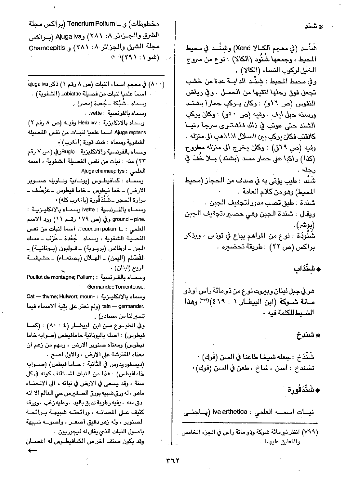 • شَنْدَقُورة: نبات اسمه العلمي: iva arthetica ( باجني مخطوطات) و Tenerium Polium L. ( براكس مجلة الشرق والجزائر 8: 281) و Ajuga iva ( براكس مجلة الشرق والجزائر 8: 281) و Chamoepitis ( شو 1: 291)