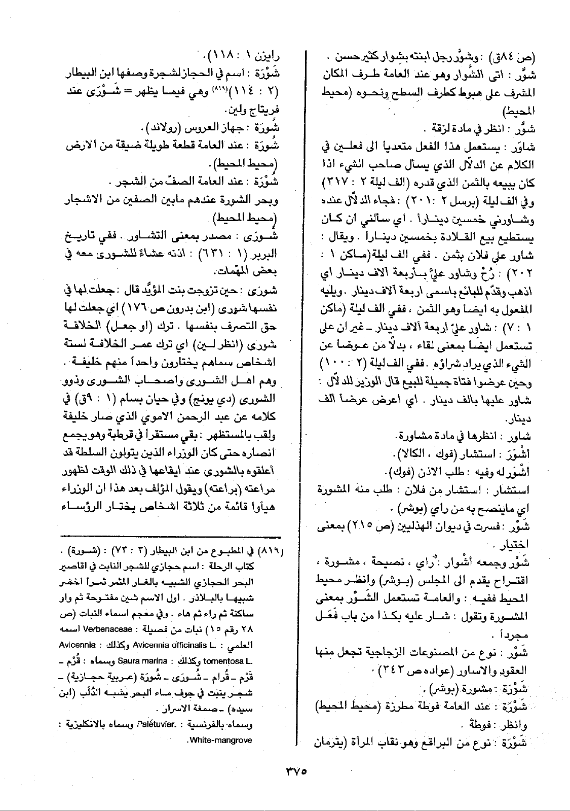 وبحر الشورة عندهم ما بين الصفين من الأشجار (محيط المحيط) شُورَى: مصدر بمعنى التشاور. ففي تاريخ البربر (1: 631): أذنه عشاءً للشورى معه في بعض المهّمات.
