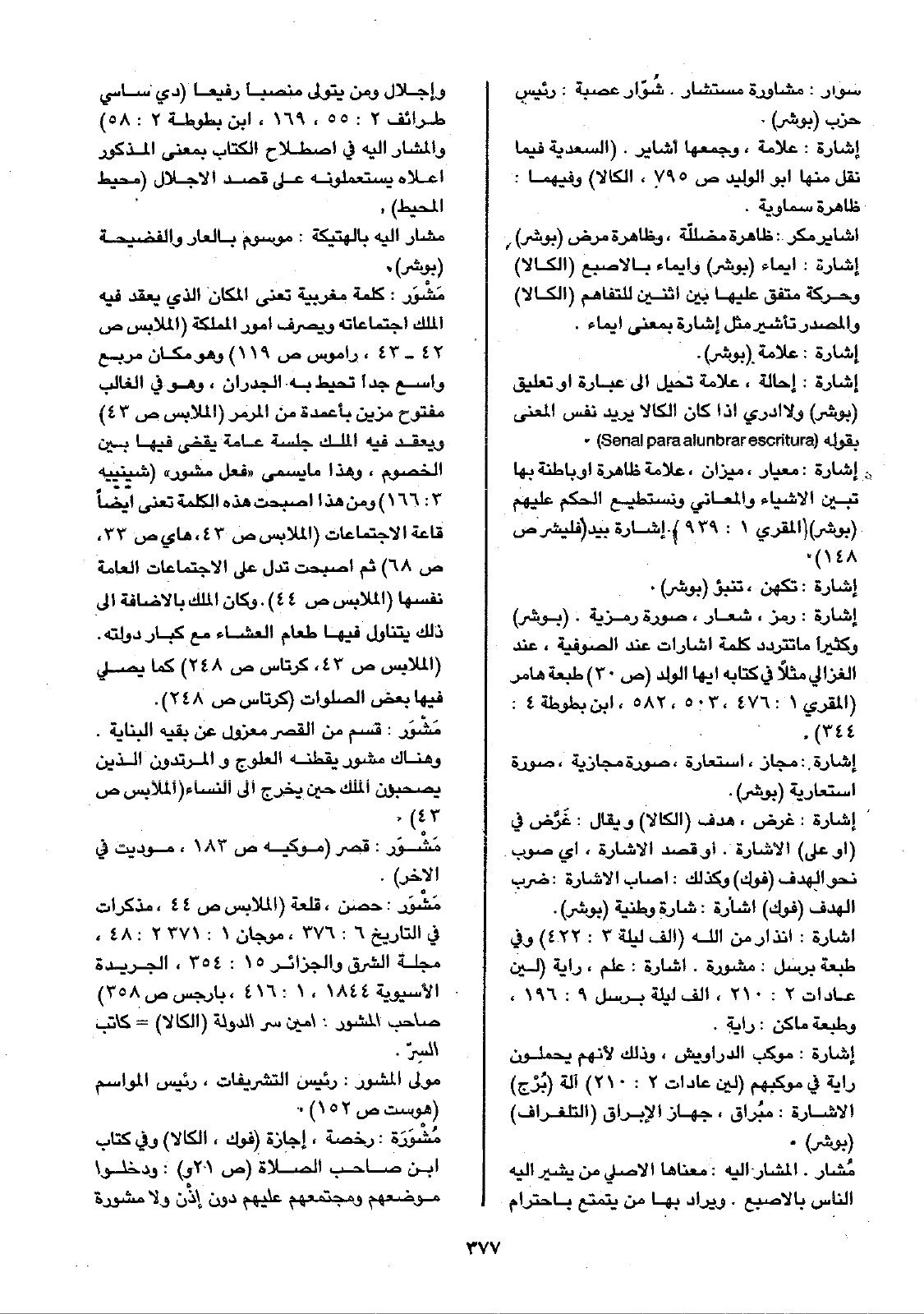 مُشار. المشار إليه: معناها الأصلي من يشير إليه الناس بالإصبع. ويراد بها من يتمتع باحترام وإجلال ومن يتولى منصباً رفيعاً (دي ساسي طرائف 2: 55، 169، ابن بطوطة 2: 58) والمشار إليه في اصطلاح الكتاب بمعنى المذكور أعلاه يستعملونه على قصد الإجلال (محيط المحيط).
