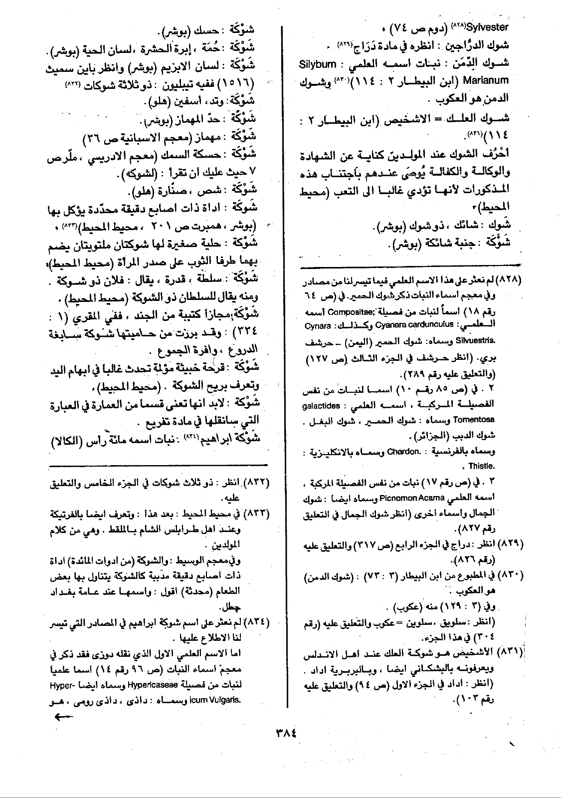 شوك الِدّمَن: نبات اسمه العلمي: Silybum Marianum ( ابن البيطار 2: 114) وشوك الدمن هو العكوب.
