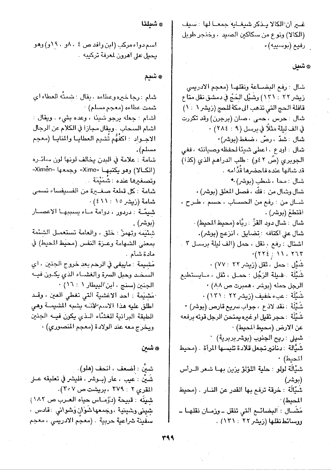 • شيل: شال: رفع البضاعة ونقلها (معجم الادريسي زيشر 22: 131) وشَيْل الحَجْ في دمشق نقل متاع قافلة الحج التي تذهب إلى مكة للحج (زيشر 1: 1) شال: حرس، حمى، صان (برجرن) وقد تكررت في ألف ليلة مثلاً في برسل (9: 284).