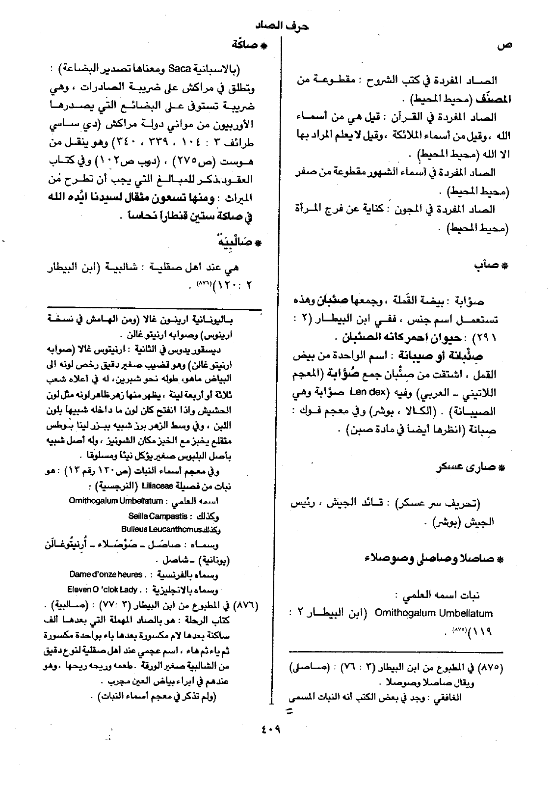 • صاصلا وصاصلي وصوصلاء: نبات اسمه العلمي: Orinthogalum Umbellatum ( ابن البيطار 2: 119).