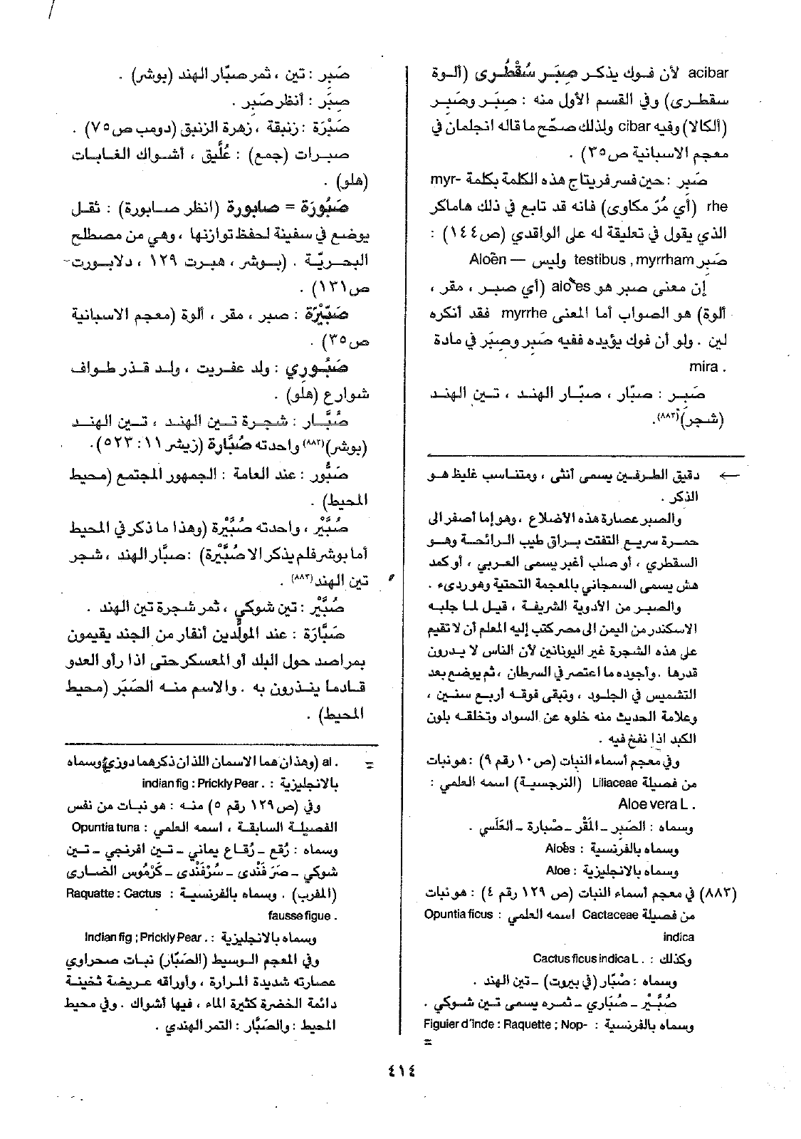 acibar لأن فوك يذكر صِبَر سُقْطُرى (ألوة سقطرى) وفي القسم الأول منه: صِبَر وصَبِر (ألكالا) وفيه cibar ولذلك صحّح ما قاله انجلمان في معجم الأسبانية ص35).
