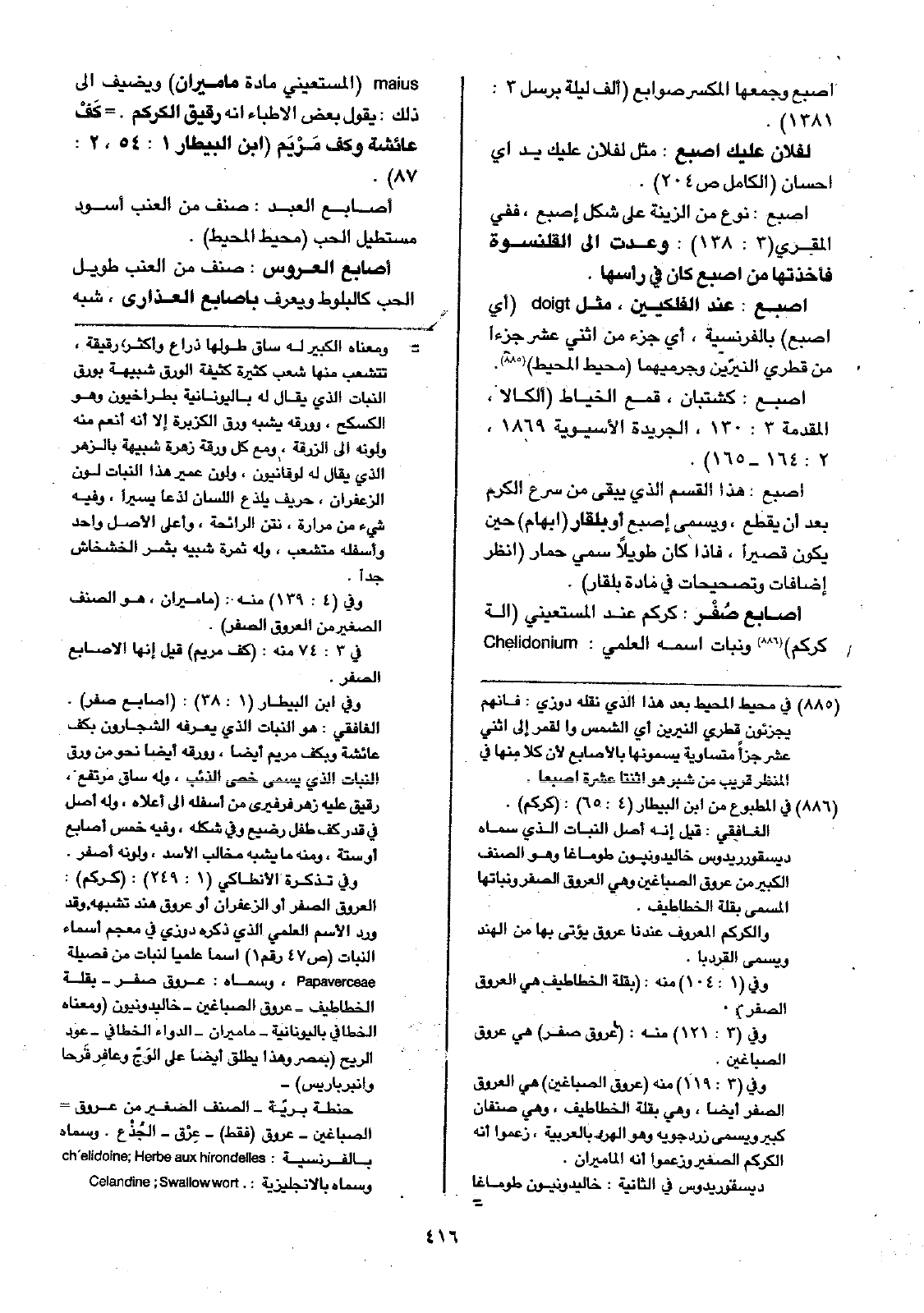 أصابع صُفْر: كركم عند المستعيني (آلة كركم) ونبات اسمه العلمي: Chelidonium maius ( المستعيني مادة ماميران) ويضيف إلى ذلك: يقول بعض الأطباء إنه رقيق الكركم. = كَفْ عائشة وكف مَرْيَم (ابن البيطار 1: 54، 2: 87).