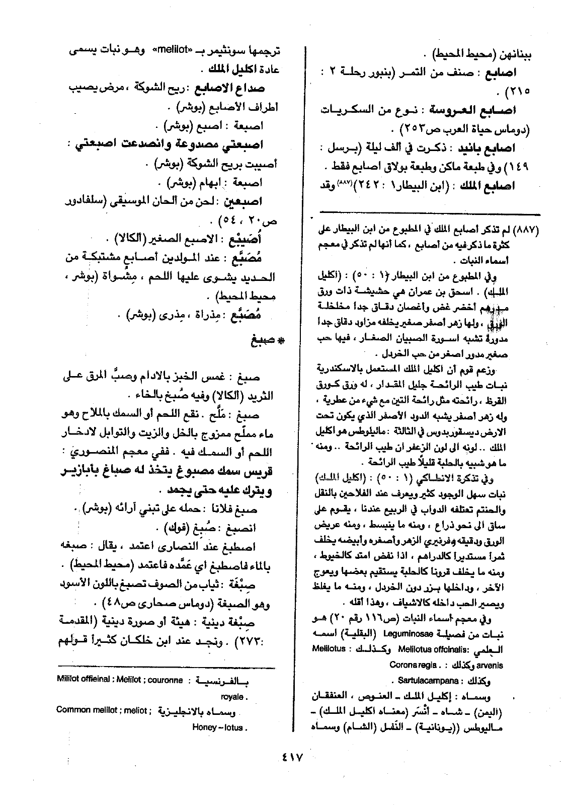 أصابع الملك: (ابن البيطار 1: 242) وقد ترجمها سونثيمر ب (( melilot)) وهو نبات يسمى عادة إكليل الملك.