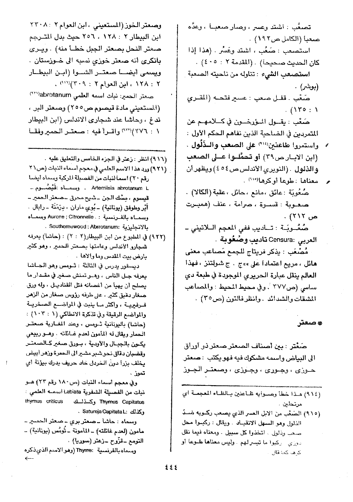 صعتر الحمير: نبات اسمه العلمي abrotanum ( المستعيني مادة قيصوم ص255) وصعتر البر، ندغ، وحاشا عند شجارى الاندلس (ابن البيطار 1: 276) واقرأ فيه: صعتر الحمير وفقاً