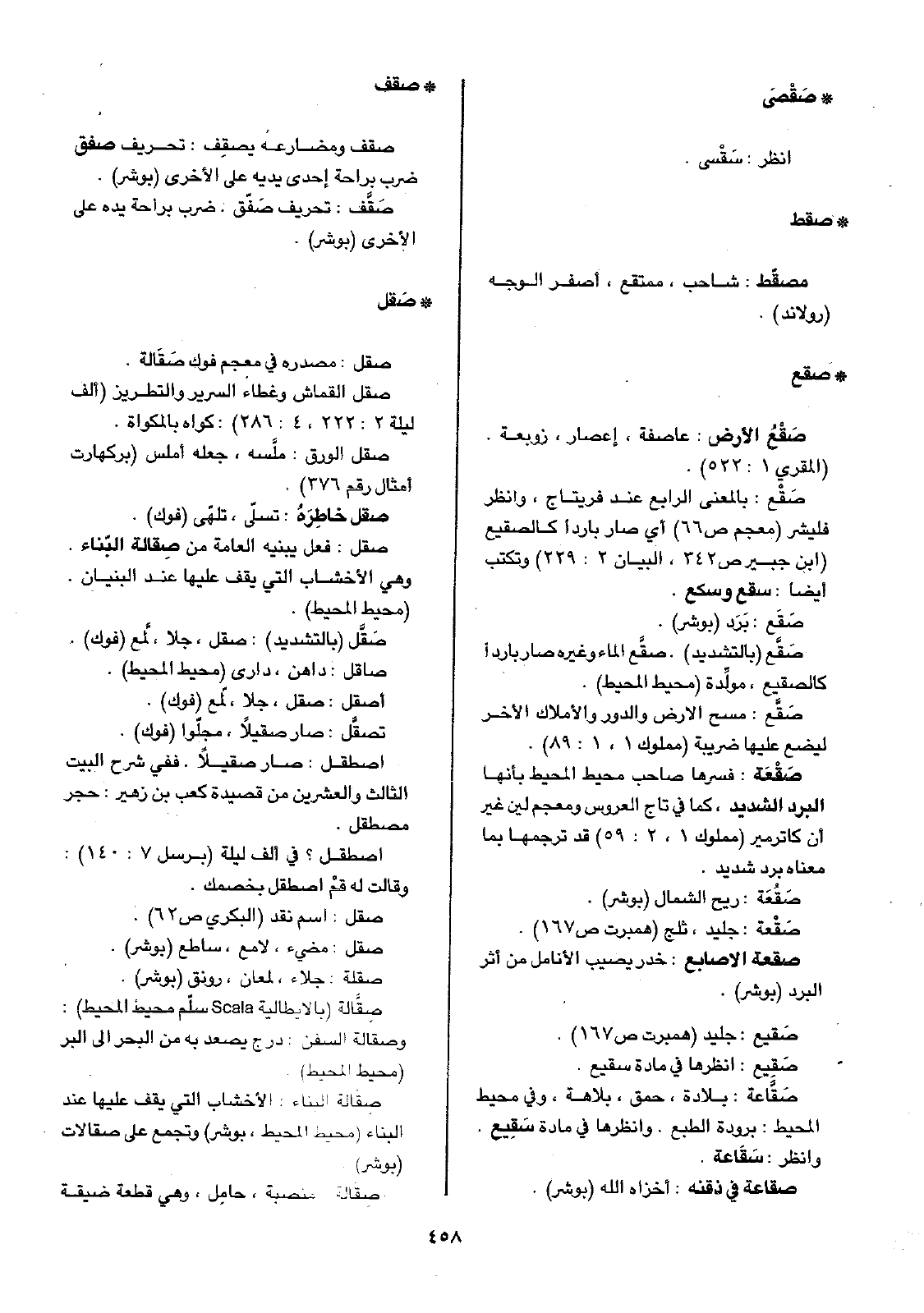 صَقْعَة: فسرها صاحب محيط المحيط بأنها البرد الشديد، كما في تاج العروس ومعجم لين غير أن كاترمير (مملوك 1، 2: 59) قد ترجمها بما معناه برد شديد.