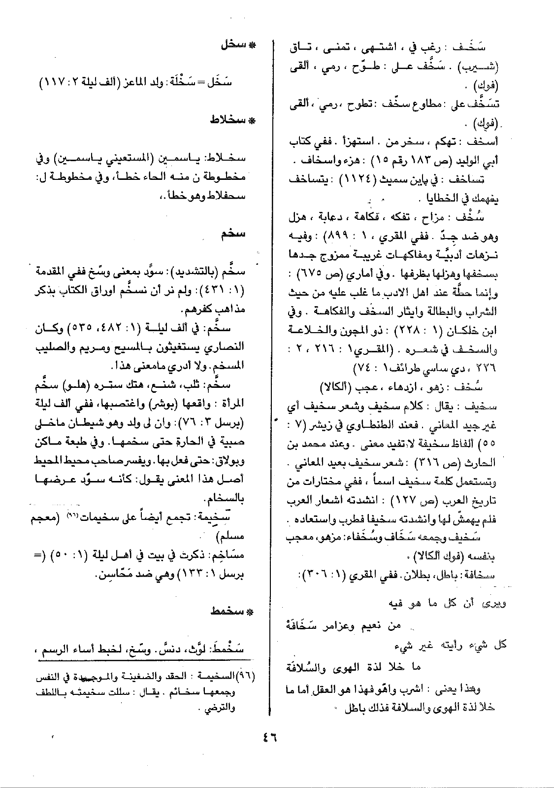 • سخل: سَخَل = سَخْلَة: ولد الماعز (ألف ليلة 2: 117) • سخلاط: سخلاط: ياسمين (المستعيني ياسمين) وفي مخطوطة ن منه الحاء خطأ، وفي مخطوطة ل: سحفلاط وهو خطأ.،• سخم: سخَّم (بالتشديد): سوَّد بمعنى وسّخ ففي المقدمة (1: 431): ولم نر أن نسخَّم أوراق الكتاب بذكر مذاهب كفرهم.