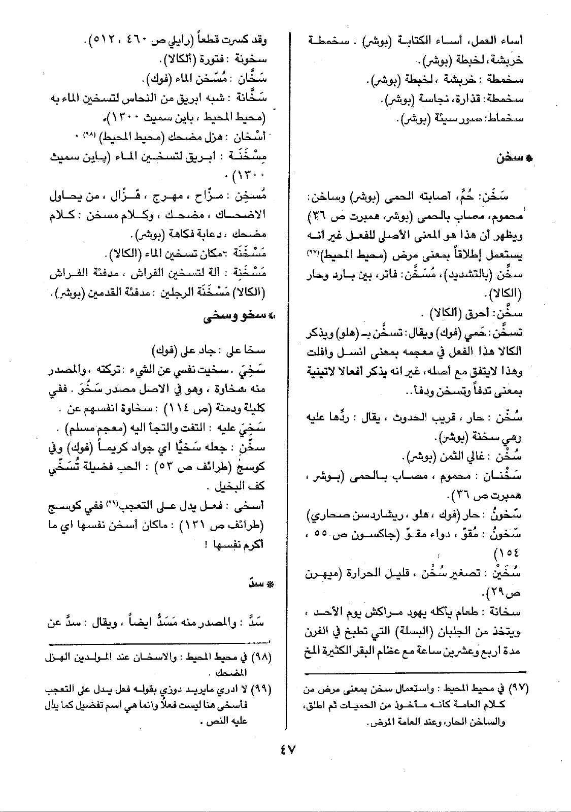 • سخن: سَخَن: حُمَّ، أصابته الحمى (بوشر) وساخن: محموم، مصاب بالحمى (بوشر، همبرت ص36) ويظهر أن هذا هو المعنى الأصلي للفعل غير إنه يستعمل إطلاقاً بمعنى مرض (محيط المحيط) سخِّن (بالتشديد)، مُسَخَّن: فاتر، بين بارد وحار (الكالا).