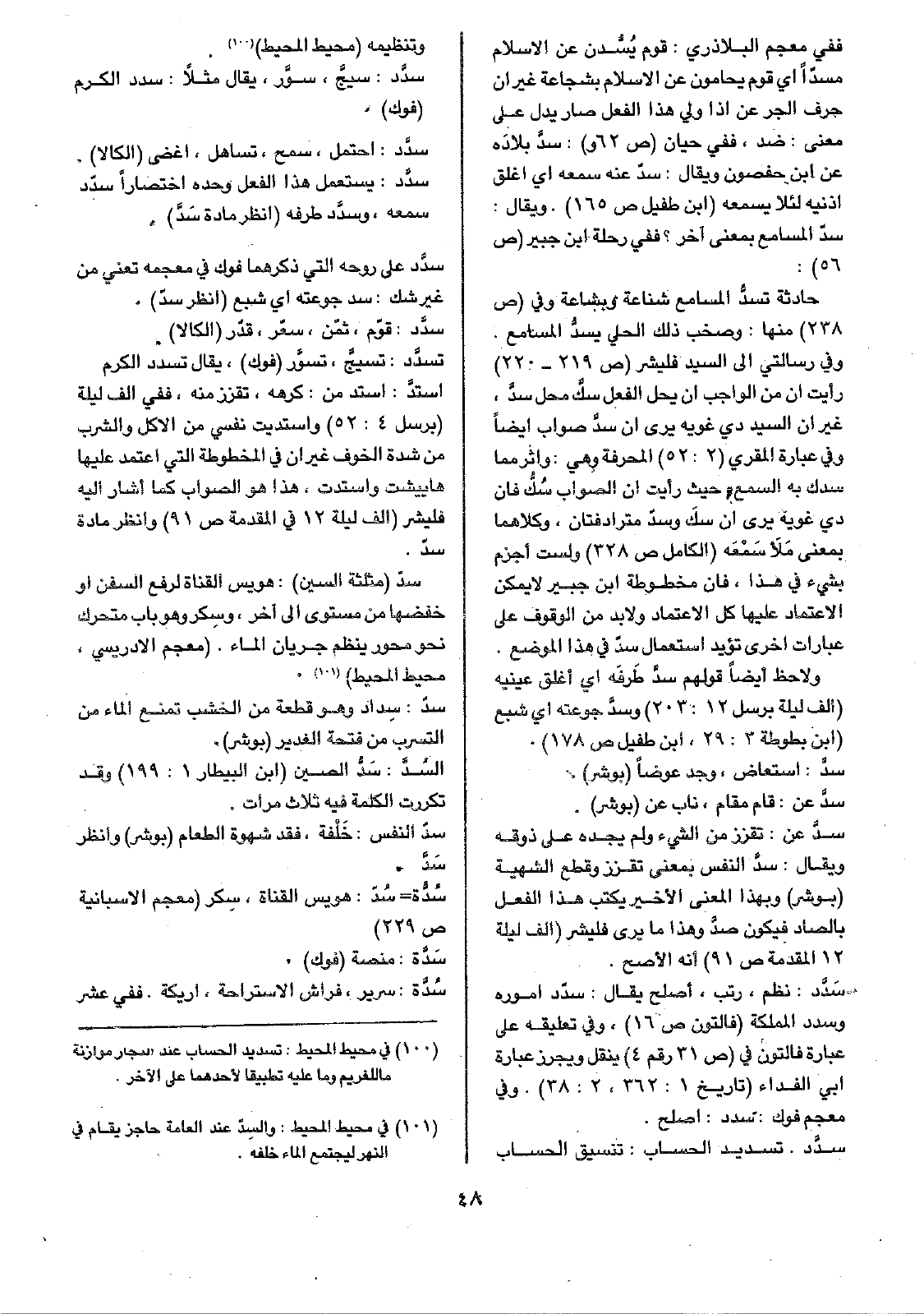 ففي معجم البلاذري: قوم يُسَّدن عن الإسلام مسدّاً أي قوم يحامون عن الإسلام بشجاعة غير أن حرف الجر عن إذا ولي هذا الفعل صار يدل على معنى: ضد، ففي حيان (ص62 و): سدَّ بلادَه عن ابن حفصون ويقال: سدّ عنه سمعه أي اغلق أذنيه لئلا يسمعه (ابن طفيل ص165). ويقال: سدّ المسامع بمعنى آخر؟ ففي رحلة ابن جبير (ص56): حادثة تسدُّ المسامع شناعة وبشاعة وفي (ص238) منها: وصخب ذلك الحلي يسدُّ المسامع. وفي رسالتي إلى السيد فليشر (ص219 - 220) رأيت أن من الواجب أن يحل الفعل سكَّ محل سدَّ، غير أن السيد دي غويه يرى ان سدَّ صواب أيضاً وفي عبارة المقري (2: 52) المحرفة وهي: واثر مما سدك به السمع، حيث رأيت أن الصواب سُكُّ فإن دي غويه أن سكَ وسدّ مترادفتان، وكلاهما بمعنى مَلأَ سَمْعَه (الكامل ص328) ولست أجزم بشيء في هذا، فان مخطوطة ابن جبير لا يمكن الاعتماد عليها كل الاعتماد ولابد من الوقوف على عبارات أخرى تؤيد استعمال سدّ في هذا الموضع.