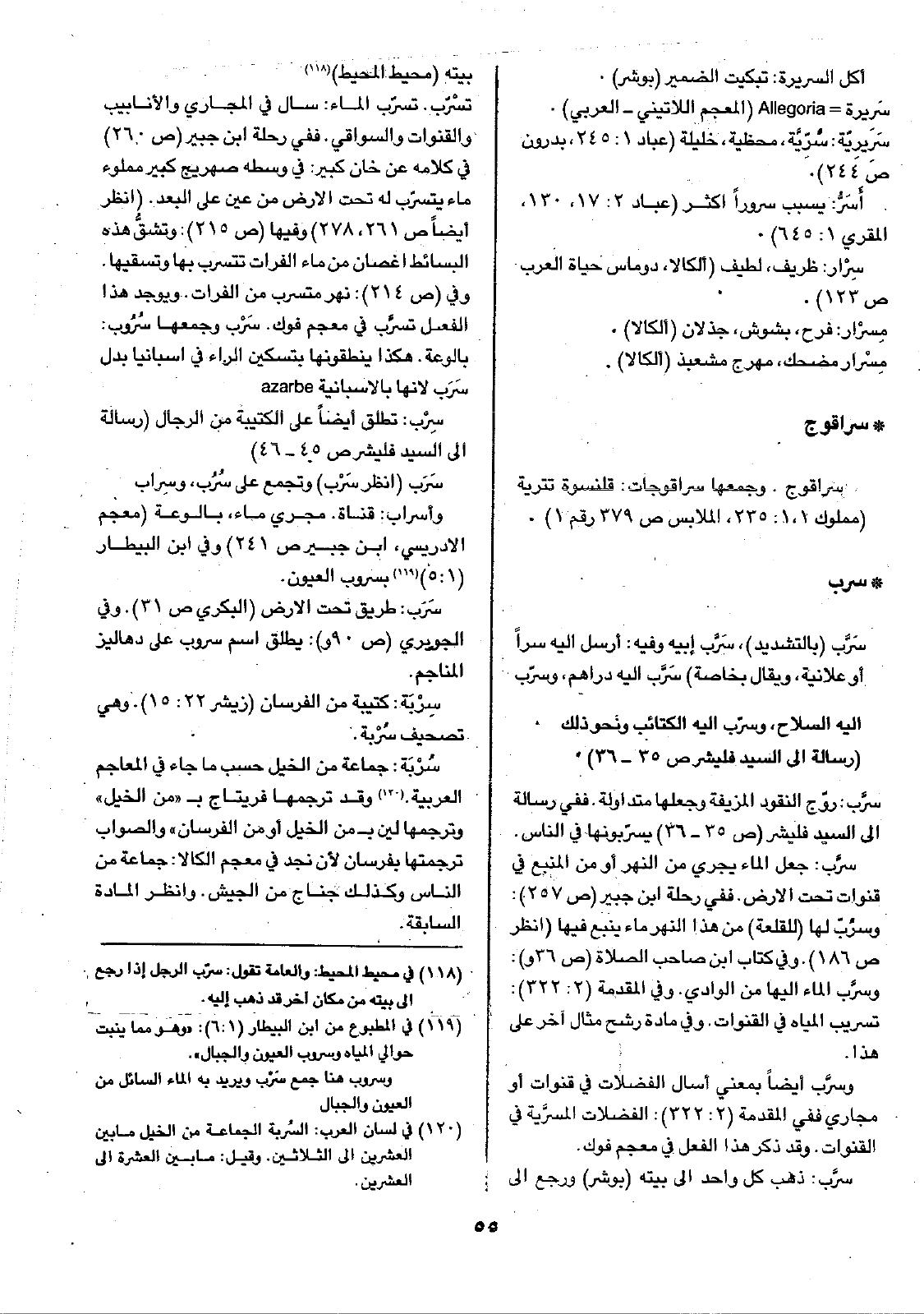سرَّب: ذهب كل واحد إلى بيته (بوشر) ورجع إلى بيته (محيط المحيط) تسْرّب. تسرّب الماء: سال في المجاري والأنابيب والقنوات والسواقي. ففي رحلة ابن جبير (ص260) في كلامه عن خان كبير: في وسطه صهريج كبير مملوء ماء يتسرّب له تحت الأرض من عين على البعد. (انظر أيضاً ص261، 278) وفيها (ص215): وتشقُّ هذه البسائط أغصان من ماء الفرات تتسرب بها وتسقيها. وفي (ص214): نهر متسرب من الفرات. ويوجد هذا الفعل تسرَّب في معجم فوك. سَرْب وجمعها سُرُوب: بالوعة. هكذا ينطقونها بتسكين الراء في أسبانيا بدل سَرَب لأنها بالأسبانية azarbe سِرْب: تطلق أيضاً على الكتيبة من الرجال (رسالة إلى السيد فليشر ص45 - 46) سَرَب (انظر سَرْب) وتجمع على سُرُب، وسِراب وأسراب: قناة. مجري ماء، بالوعة (معجم الادريسي، ابن جبير ص241) وفي ابن البيطار (1: 5) بسروب العيون.
