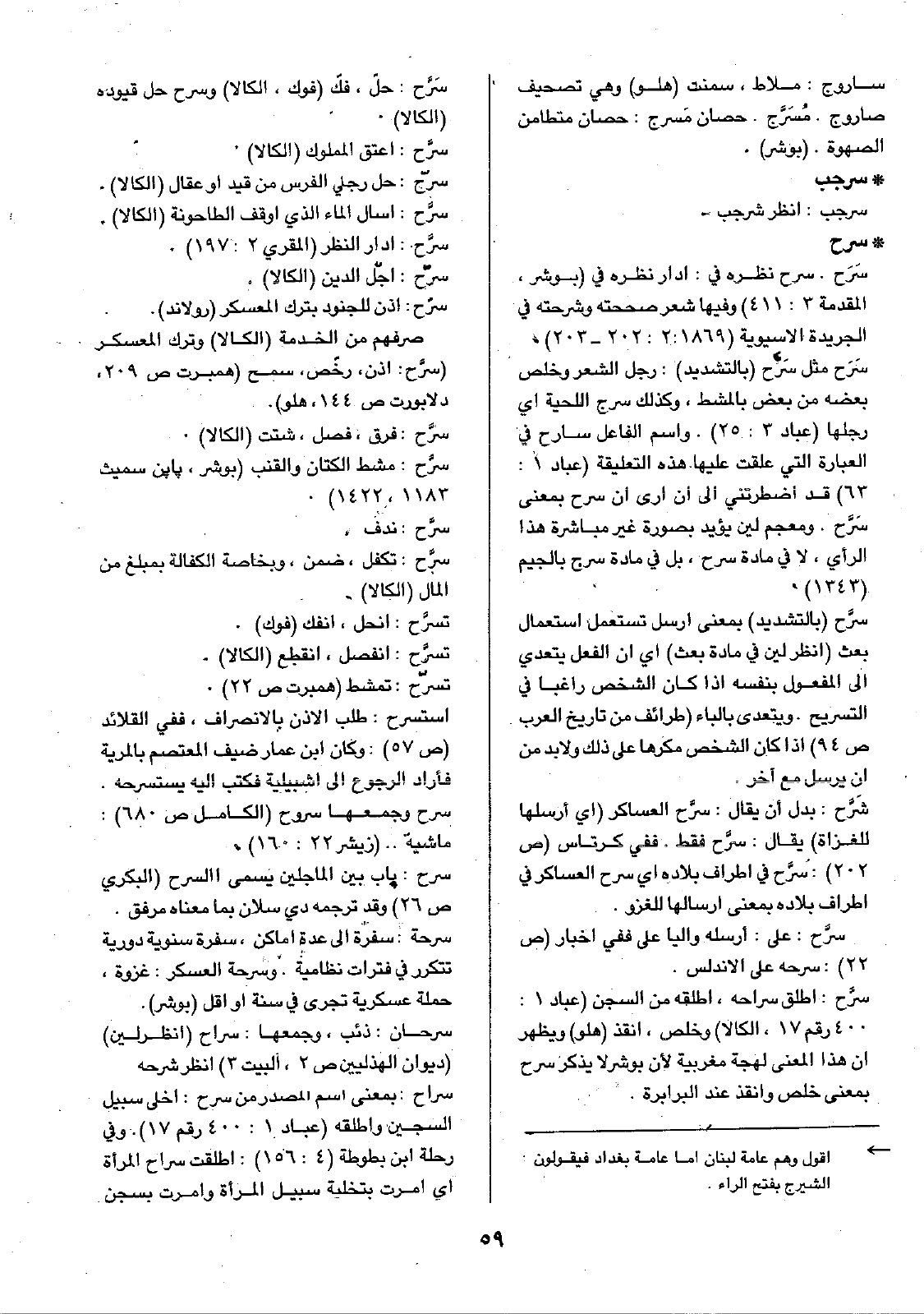 سَرَح مثل سَرَّح (بالتشديد): رجل الشعر وخلص بعضه من بعض بالمشط، وكذلك سرج اللحية أي رجلها (عباد 3: 25). واسم الفاعل سارح في العبارة التي علقت عليها هذه التعليقة (عباد 1: 63) قد اضطرتني إلى أن أرى أن سرح بمعنى سَرَّح. ومعجم لين يؤيد بصورة غير مباشرة هذا الرأي، لا في مادة سرح، بل في مادة سرج بالجيم (1343) سرَّح (بالتشديد) بمعنى أرسل تستعمل استعمال بعث (انظر لين في مادة بعث) أي أن الفعل يتعدى إلى المفعول بنفسه إذا كان الشخص راغبا في التسريح. ويتعدى بالباء (طرائف من تاريخ العرب ص94) إذا كان الشخص مكرها على ذلك ولابد من أن يرسل مع آخر.
