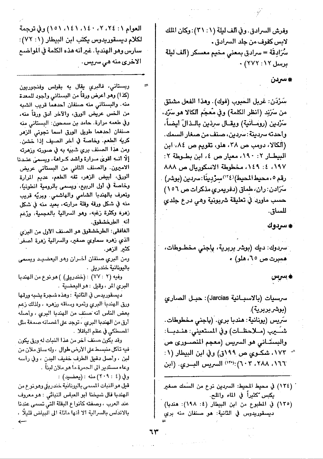 سَريس (يونانية: هندبا بري. (باجني مخطوطات. شَيرب (ملاحظات) وفي المستعيني: هندبا: والبستاني هو السريس (معجم المنصورى ص173، شكوي ص199 ق) وفي ابن البيطار (1: 166، 288، 603): السريس البري. (ابن العوام 1: 24، 2، 140، 141، 151) وفي ترجمة لكلام ديسقوريدوس يكتب ابن البيطار (1: 72): سارس وهو الهندبا. غير إنه هذه الكلمة في المواضع الأخرى منه هي سريس.