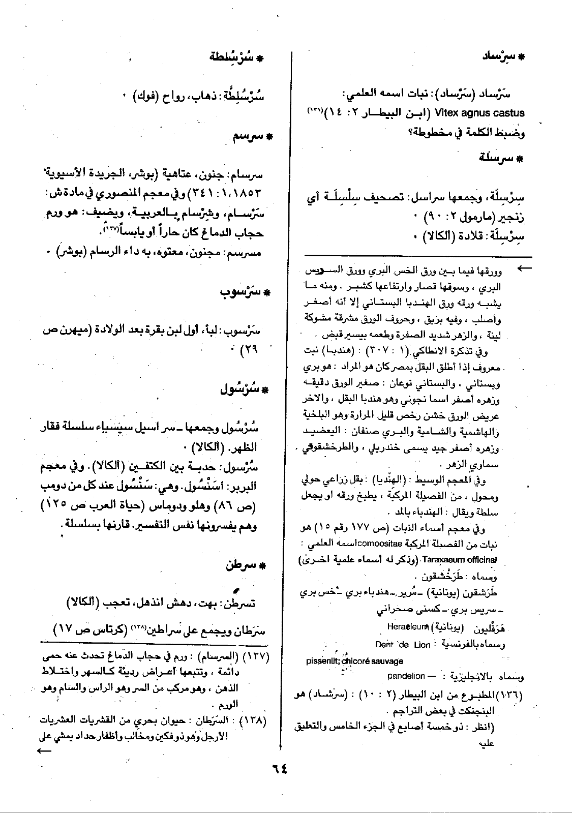 • سِرْساد: سَرْساد (سَرْساد): نبات اسمه العلمي: Vitex agnus castus ( ابن البيطار 2: 14 وضبط الكلمة في مخطوطة؟ • سرسلة: سِرْسِلَة، وجمعها سراسل: تصحيف سِلْسِلَة أي زنجير (مارمول 2: 90).