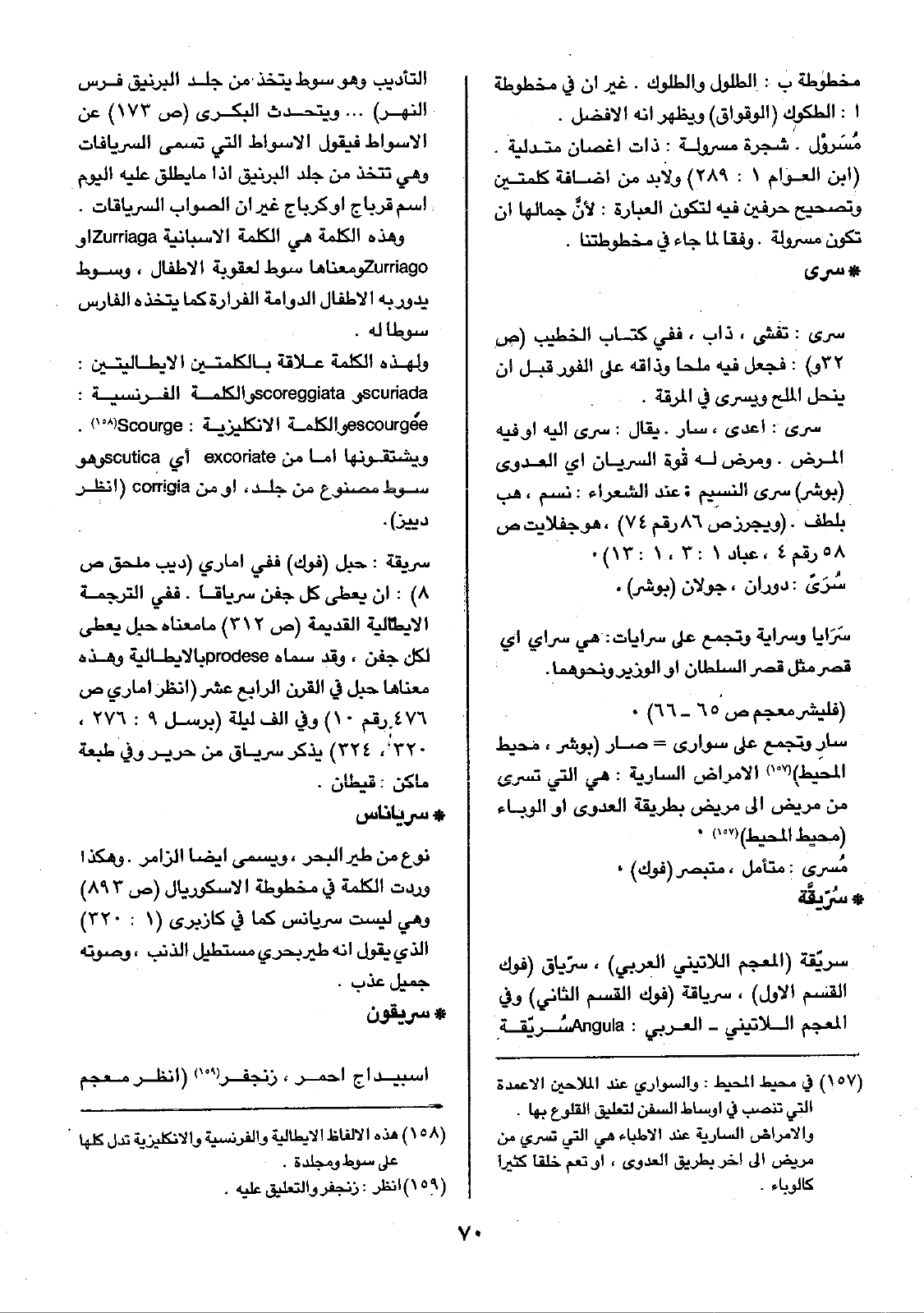 • سرياناس: نوع من طير البحر، ويسمى أيضاً الزامر. وهكذا وردت الكلمة في مخطوطة الاسكوريال (ص893) وهي ليست سريانس كما في كازبرى (1: 320) الذي يقول إنه طير بحري مستطيل الذنب، وصوته جميل عذب.