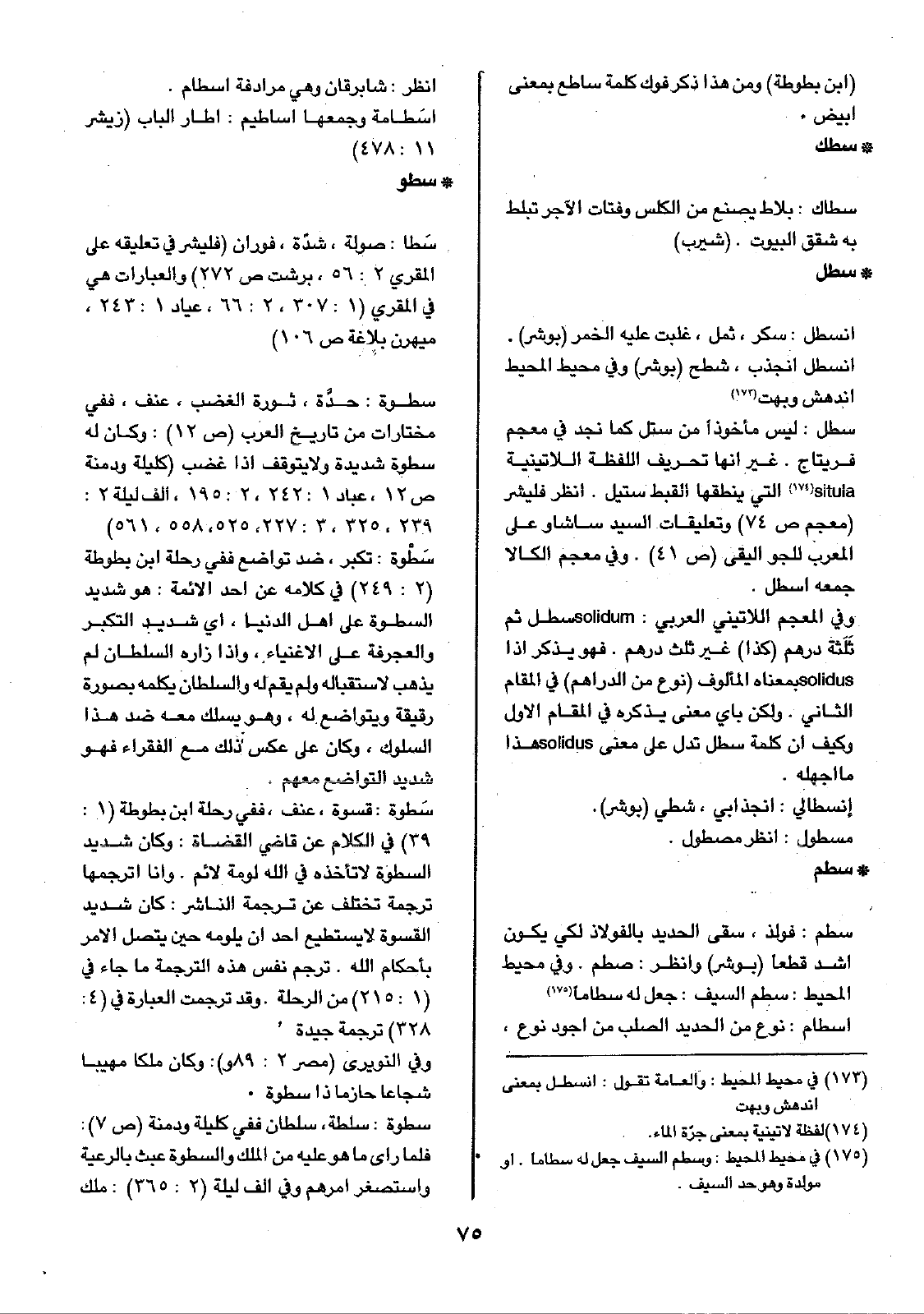 سَطوة: قسوة، عنف، ففي رحلة ابن بطوطة (1: 39) في الكلام عن قاضي القضاة: وكان شديد السطوة لا تأخذه في الله لومة لائم. وأنا أترجمها ترجمة تختلف عن ترجمة الناشر: كان شديد القسوة لا يستطيع أحد أن يلومه حين يتصل الأمر بأحكام الله. ترجم نفس هذه الترجمة ما جاء في (1: 215) من الرحلة. وقد ترجمت العبارة في (4: 328) ترجمة جيدة.