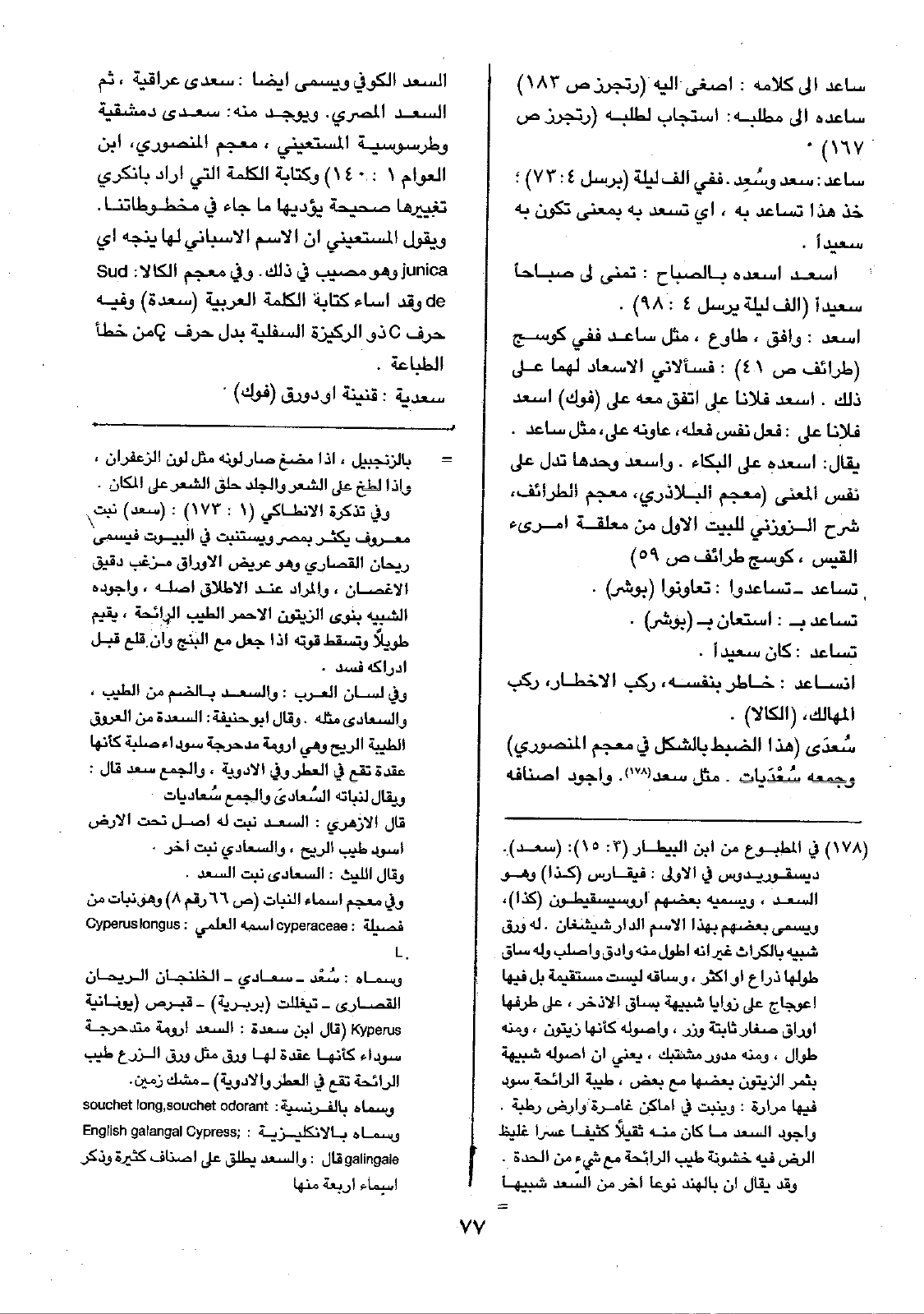 سُعدَى (هذا الضبط بالشكل في معجم المنصوري) وجمعه سُعْدَيات. مثل سعد. وأجود أصنافه السعد الكوفي ويسمى أيضا: سعدى عراقية، ثم السعد المصري. ويوجد منه: سعدى دمشقية وطرسوسية المستعيني، معجم المنصوري، ابن العوام 1: 140) وكتابة الكلمة التي أراد بانكري تغييرها صحيحة يؤديها ما جاء في مخطوطاتنا. ويقول المستعيني أن الاسم الأسباني لها ينجه أي junica وهو مصيب في ذلك. وفي معجم الكالا: Sud de وقد أساء كتابة الكلمة العربية (سعدة) وفيه حرف C ذو الركيزة السفلية بدل حرف C من خطأ الطباعة.